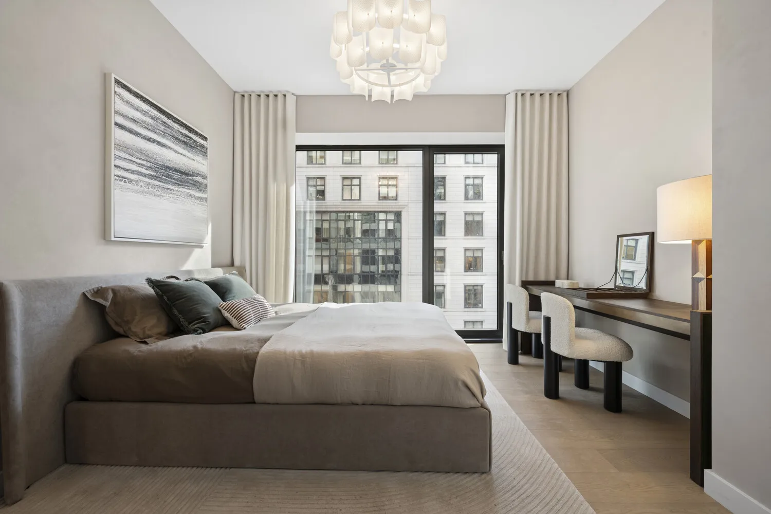 Residence 1007 is a 728-square‐foot one-bedroom home with southern exposures and a refined sense of scale and understated grandeur. A formal entry with alcove leads to the great room with 10'6" ceilings and 8-foot windows, framed by 7-inch wide White Oak flooring and uninterrupted lines.