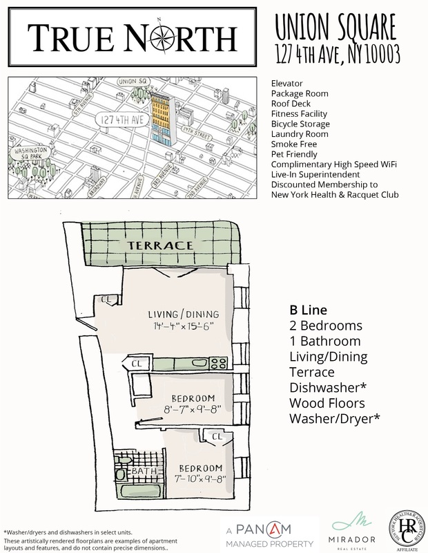 Amazing two bedroom in the heart of Union Square! This ultra-modern renovation feature two fairly equal bedrooms facing 13th Street, high ceilings, and beautiful dark hardwood floors. The living area is pure sweeping window views of Union Square. There is a large private patio that can easily accommodate a table and chairs. There is a washer dryer in unit, next to the gorgeous penny tile bathroom with Restoration Hardware fixtures. Photos and floor plans are of a representative unit. Prices and incentives are subject to change.