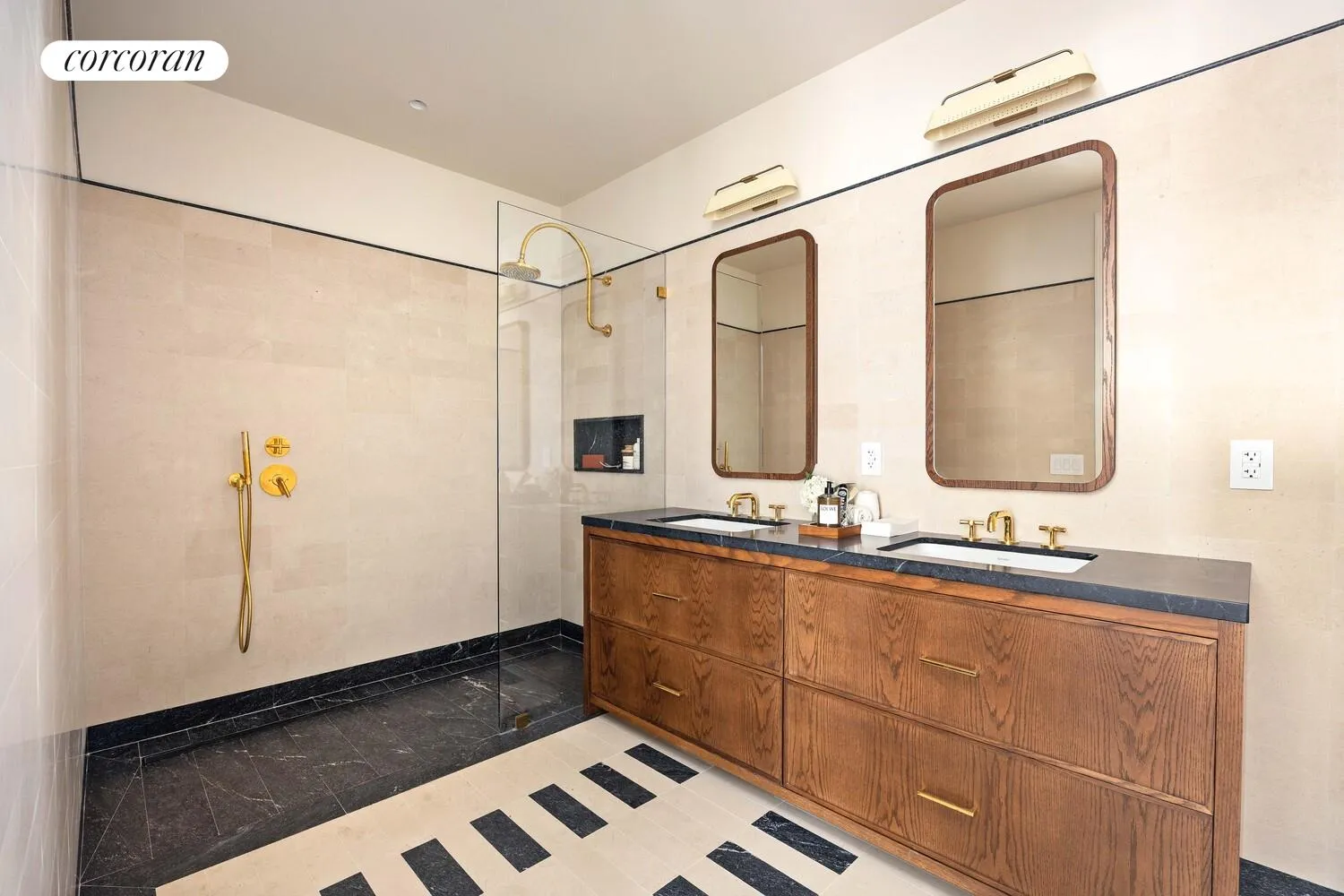 Magnificent bathrooms will take your breath away. The combination of Waterworks brass fixtures with Italian marbles creates a hotel-like level of classic styling. Primary baths include double sinks integrated into oversized floating walnut vanities with Nero Marquina tops, Caliza Capri limestone walls and floors, frameless glass showers, and in select bathrooms you will even enjoy deep soaking tubs with windowed skyline views. Secondary baths feature Italian Cotto Brick tiles, Nero Marquina tops and sizeable vanities for storage.