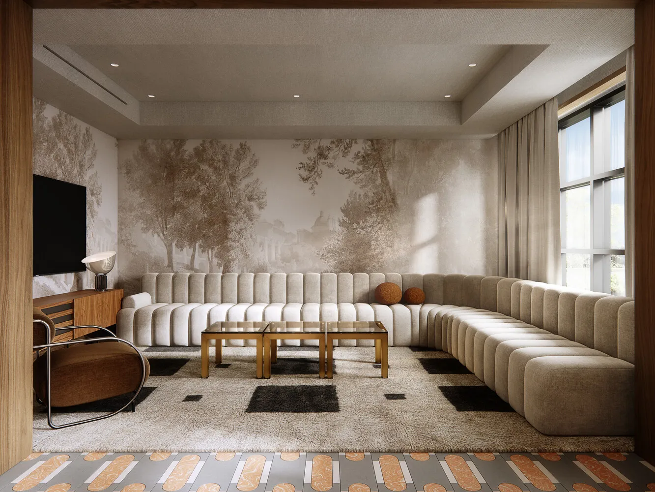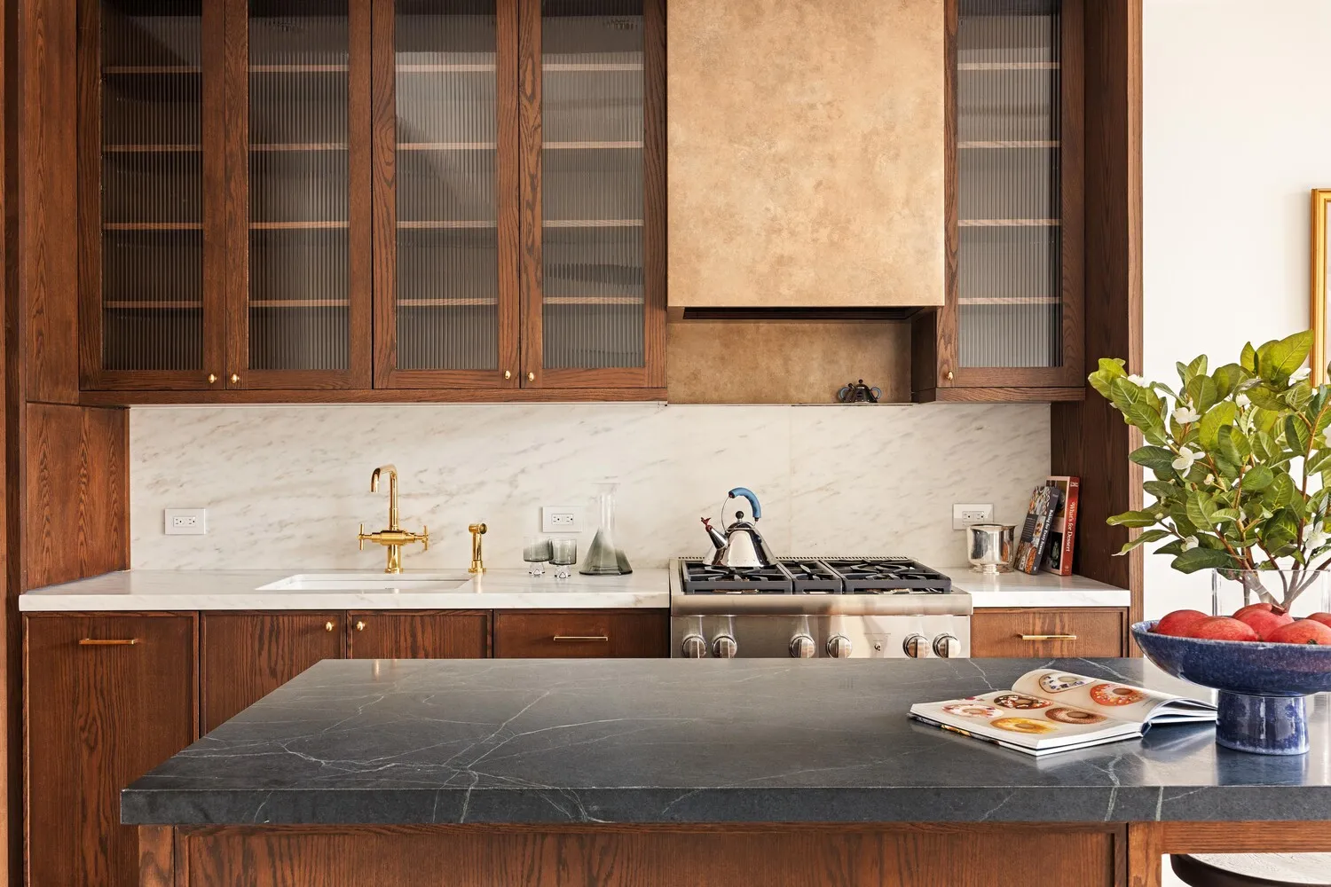 Kitchens are generously sized and are as practical as they are beautiful. Floor-to-ceiling custom walnut and reeded glass cabinetry includes generous storage and pantry space, while massive dining islands are finished with jewel-like brass footings, and countertops and backsplashes that uniquely integrate Italian soapstone and Calacatta marbles. Professional appliances include vented Thermador gas ranges with distinctive brass hoods and a paneled Bosch fridge and dishwasher package.