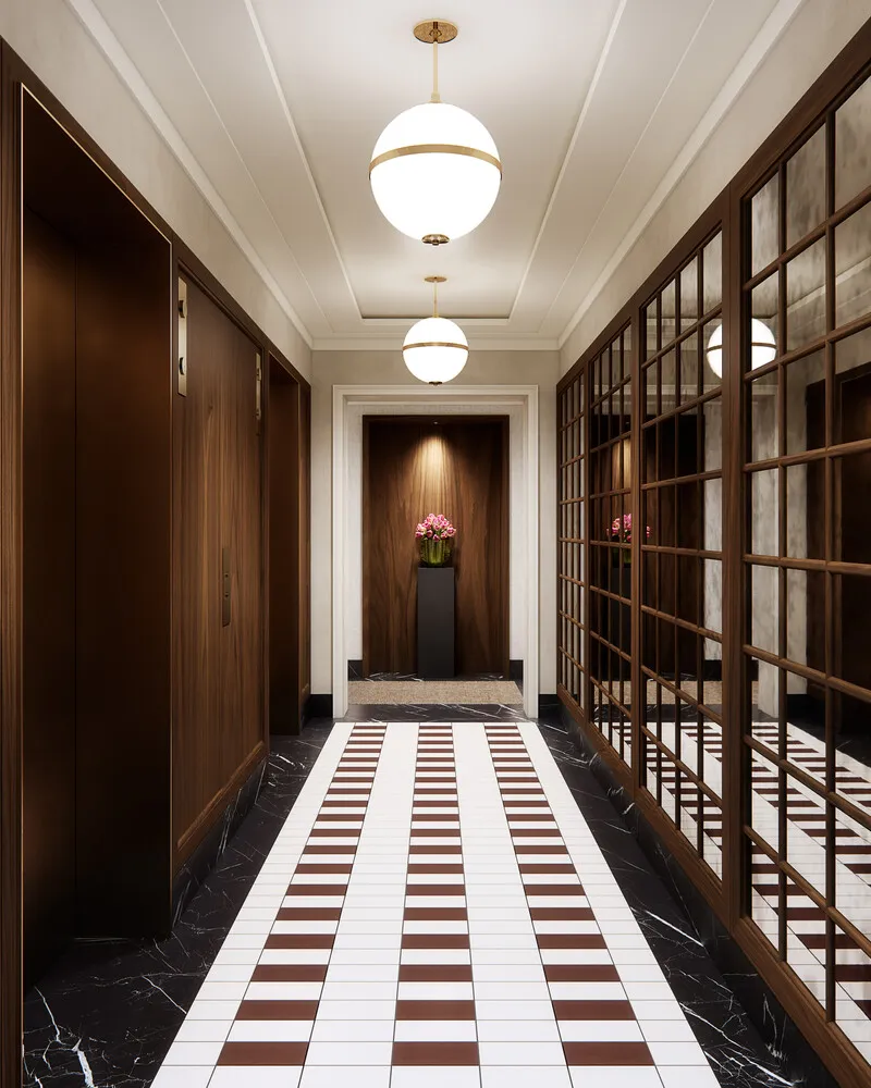 Magnificent bathrooms will take your breath away. The combination of Waterworks brass fixtures juxtaposed with Italian marbles creates a hotel-like level of classic styling. Primary bathrooms include double sinks integrated into oversized floating walnut vanities with Nero Marquina tops, Caliza Capri limestone, frameless glass showers, and in select bathrooms deep soaking tubs with windowed skyline views. Secondary baths feature Italian Cotto Brick tiles, Nero Marquina tops and sizeable vanities for storage.