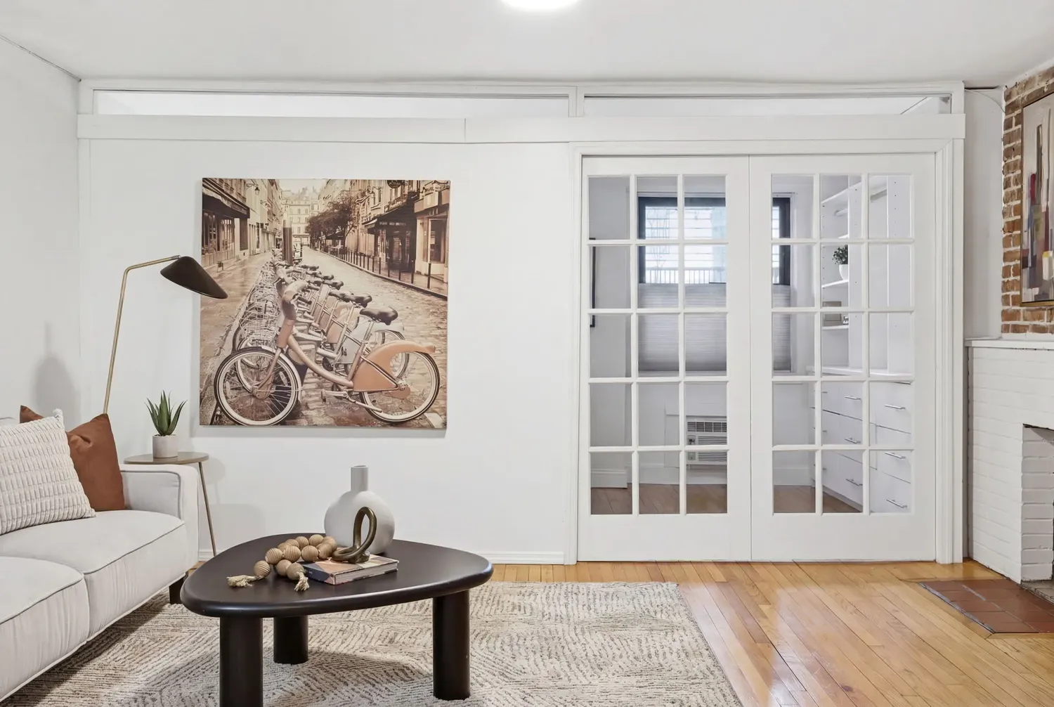 The flexible layout features a French sliding door partition creating a separate sleeping area while maintaining an open living space. Additional highlights include a decorative fireplace, built-in wardrobe, ample closet space, and a new Friedrich wall-through AC unit.