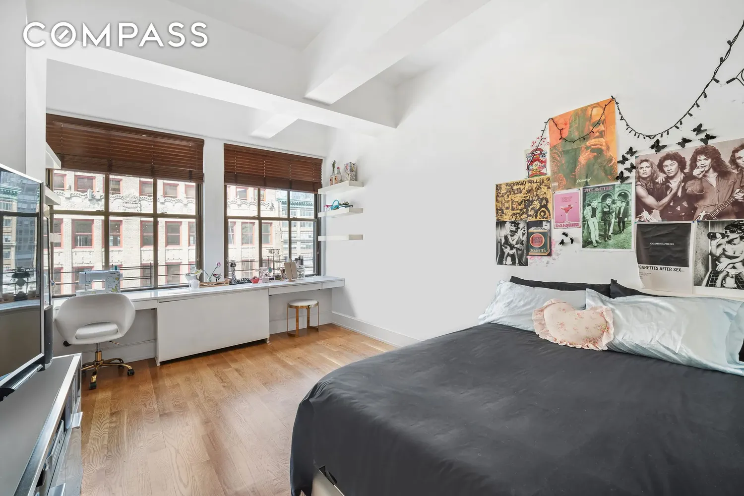 Inside this sprawling 2,256-square-foot home, 11-foot-tall beamed ceilings soar above oak hardwood floors and oversized casement windows along the northern and eastern exposures. A gracious foyer flanked by a coat closet and powder room makes a warm welcome. Ahead, the open-plan living room offers a generous footprint for seating and dining areas alongside dramatic city views, while indoor-outdoor living awaits on the adjacent terrace — the perfect destination for morning coffee or after-dinner drinks. Chefs will feel right at home in the open kitchen, where white oak cabinetry and Calacatta marble surround a fleet of upscale stainless steel appliances.
