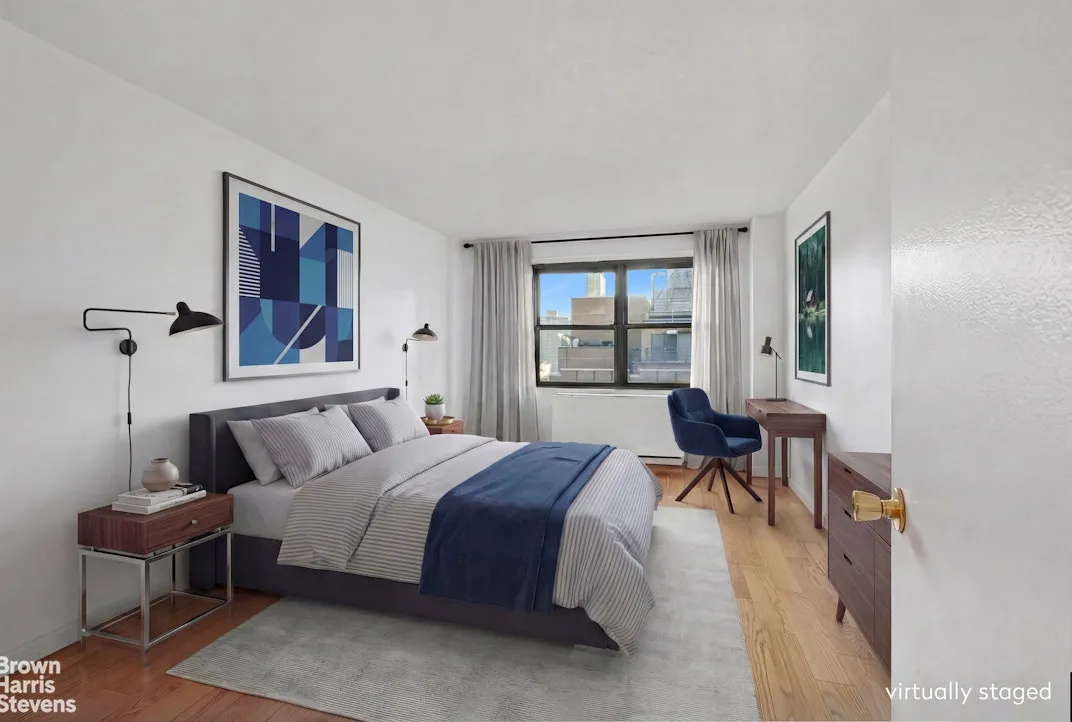 Upon entering, you're greeted by light streaming through east-facing windows and out onto your private balcony. Step outside and take in sweeping city views, including the iconic Chrysler Building. The apartment is immaculate, with beautiful wood floors throughout. The kitchen features brand-new full-size stainless steel appliances, granite countertops, and a breakfast bar perfect for casual dining. The bathroom has been thoughtfully updated with a new sink, vanity, and mirror. Four closets-one of them a walk-in-offer generous storage. The building provides exceptional amenities, including a 24-hour doorman, concierge services, a live-in superintendent, a recently renovated laundry room, storage, a service elevator, and a lovely public rooftop. A privately operated parking garage within the building offers discounted rates for shareholders.
