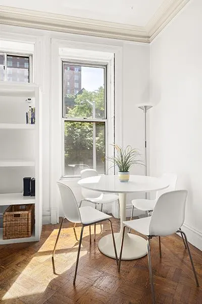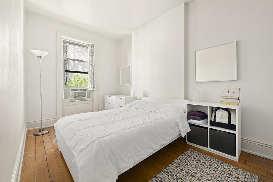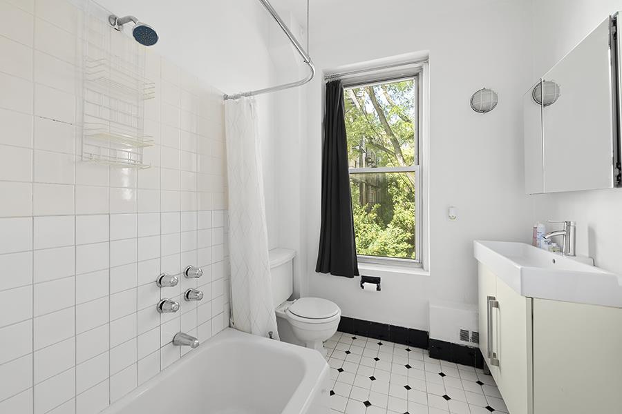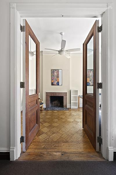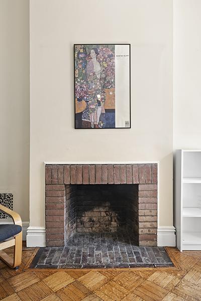 The parlour floor apartment is a one-bedroom delight. Highlights include large windows in both main rooms, high ceilings with original moldings, parquet floors, and two decorative hearths. A pocket door separates the front and rear rooms. The efficiency kitchen overlooks the townhouse garden, and the adjacent bathroom has a full-sized bathtub and shower.