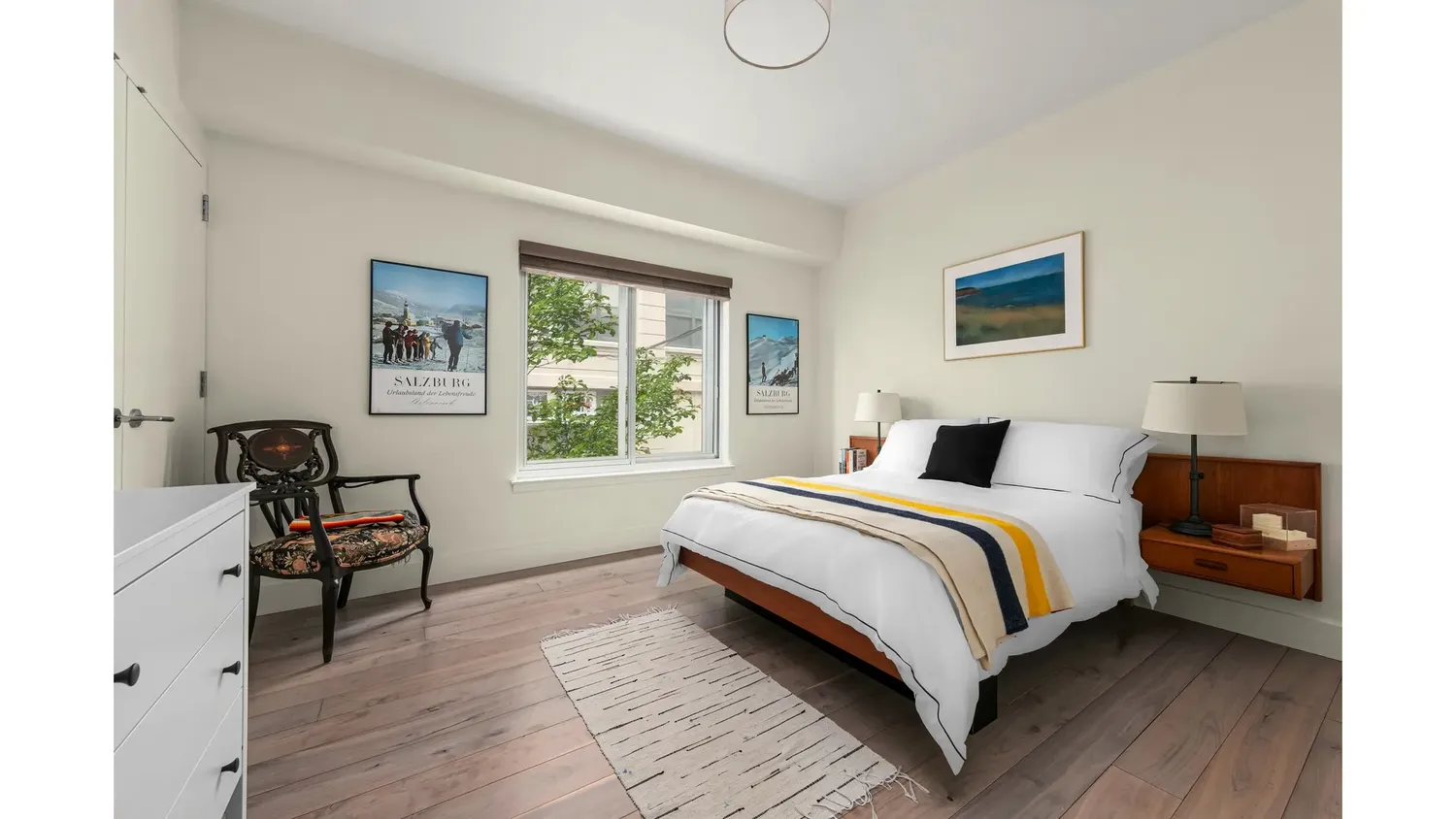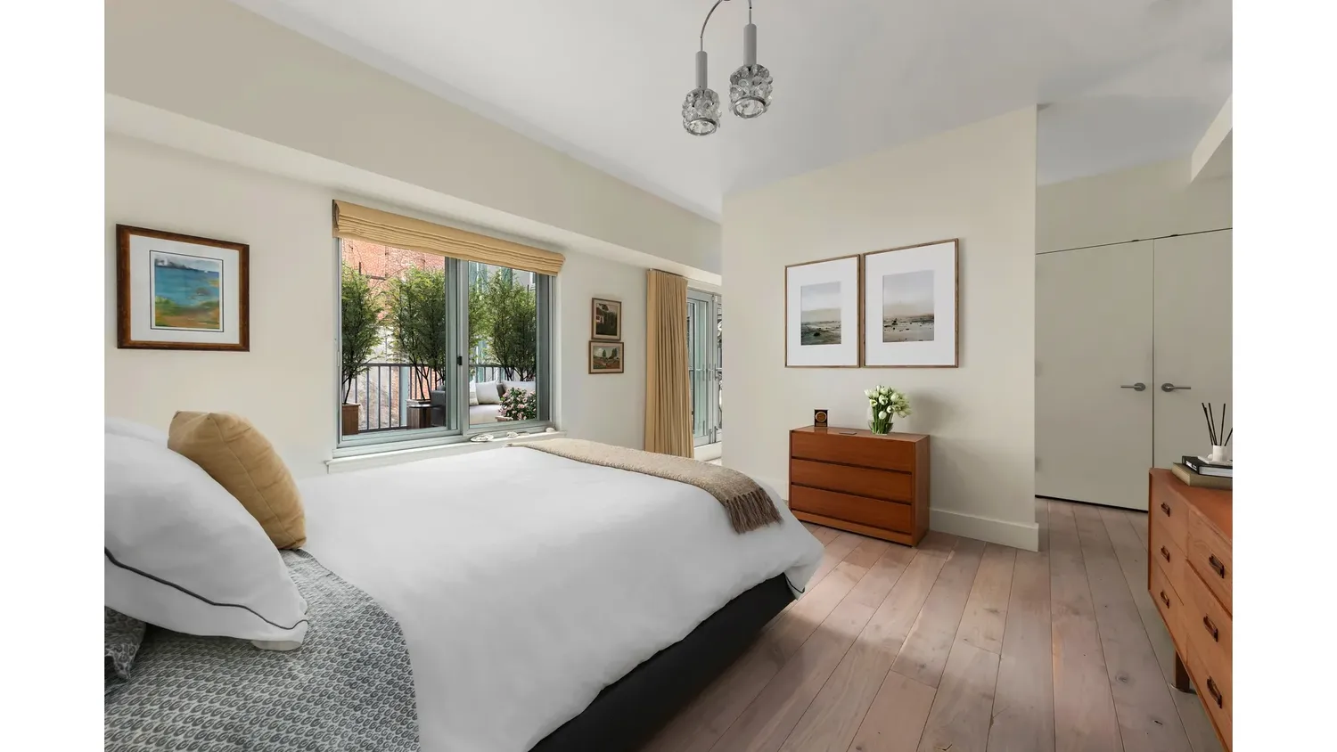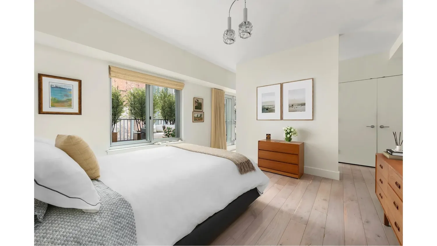 Just down the hall, the spacious and peaceful primary bedroom is appointed with a thoughtful floating privacy wall for works of art or portraits, an exceptional walk-in closet, another storage closet, and a generous ensuite bath with shower, a Vitabath soaking tub, double sinks, Restoration Hardware fittings and a Toto toilet. Just outside, your very own outdoor oasis awaits. This 280 square foot private terrace is perfect for the Sunday paper, al fresco dining or an evening cocktail. The remaining two bedrooms are both large and have excellent closets. Laundry is sensibly located at the end of the hall.