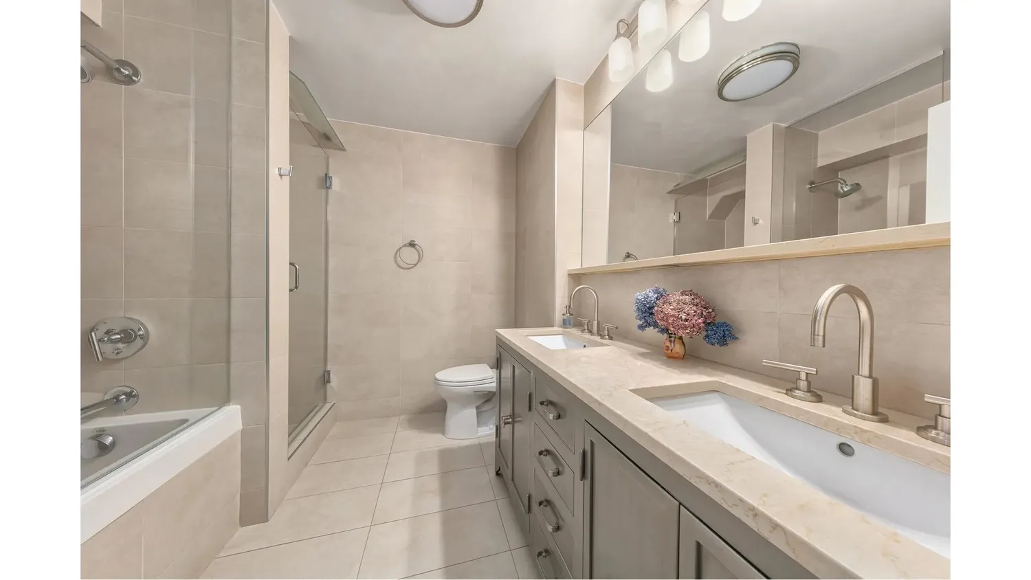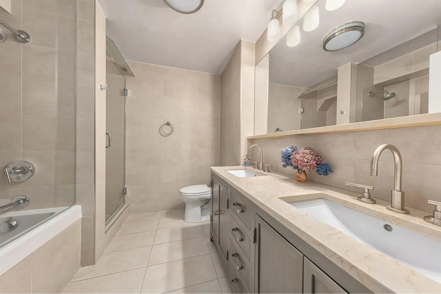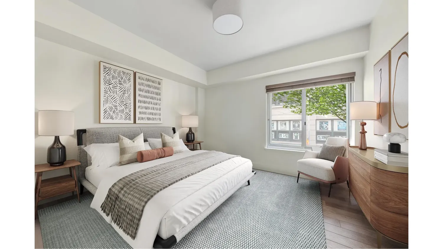 Just down the hall, the spacious and peaceful primary bedroom is appointed with a thoughtful floating privacy wall for works of art or portraits, an exceptional walk-in closet, another storage closet, and a generous ensuite bath with shower, a Vitabath soaking tub, double sinks, Restoration Hardware fittings and a Toto toilet. Just outside, your very own outdoor oasis awaits. This 280 square foot private terrace is perfect for the Sunday paper, al fresco dining or an evening cocktail. The remaining two bedrooms are both large and have excellent closets. Laundry is sensibly located at the end of the hall.