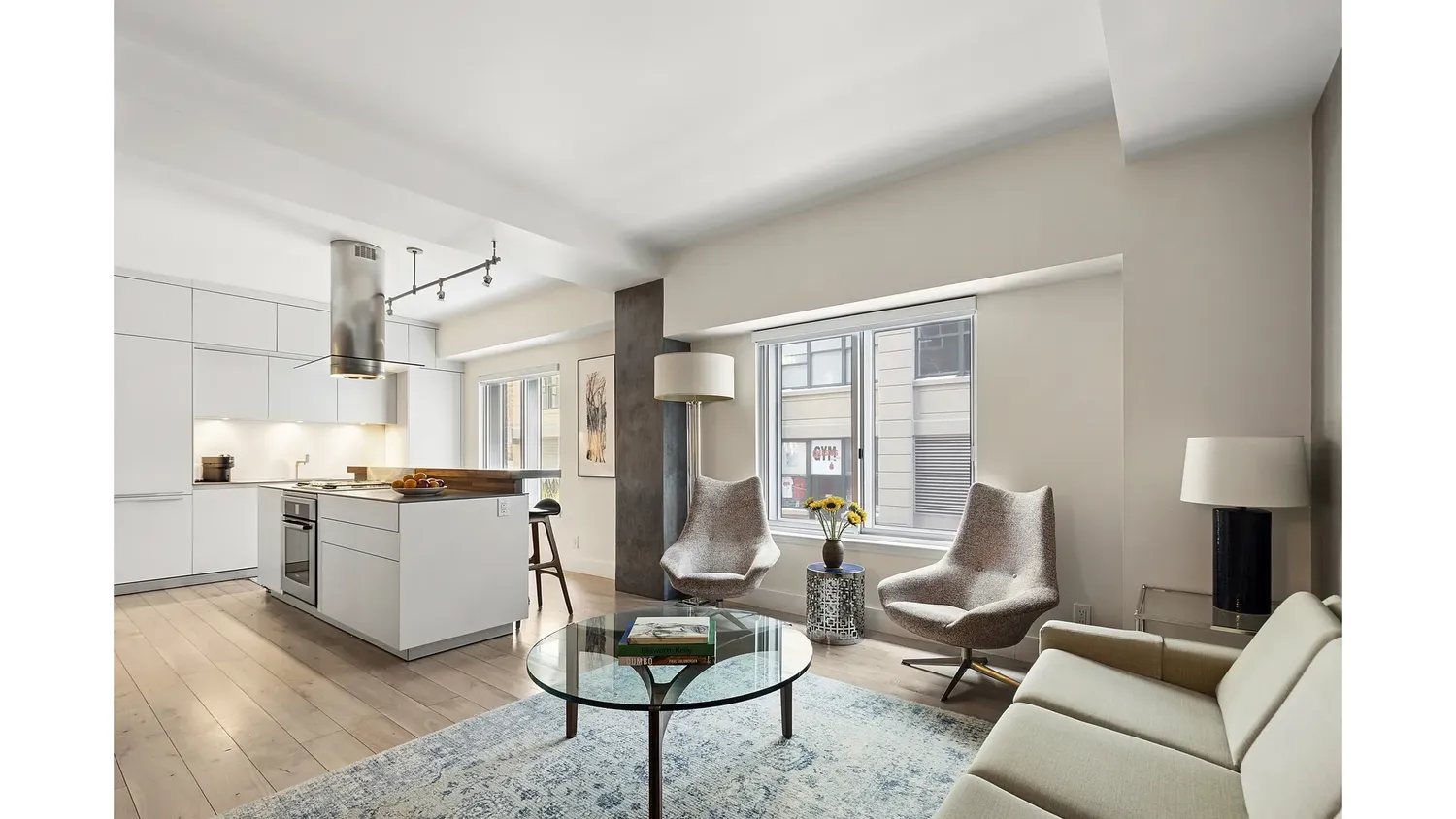 The building features triple glazed windows, acoustically super-insulated exterior walls, parking in the cellar (yes, parking spots are available for sale), a well-equipped fitness center, playroom, cold storage for grocery deliveries, an attended lobby, and an extraordinary roof deck with panoramic views of the Manhattan Bridge, Brooklyn Bridge and lower Manhattan skyline.