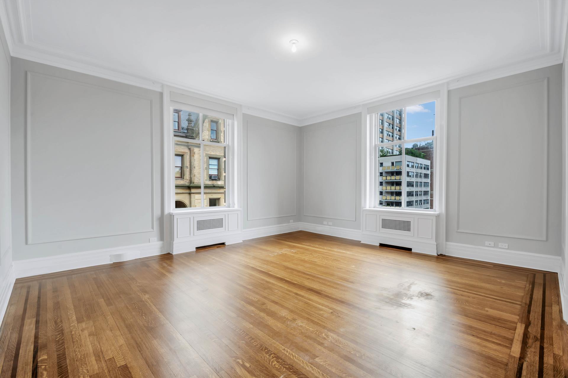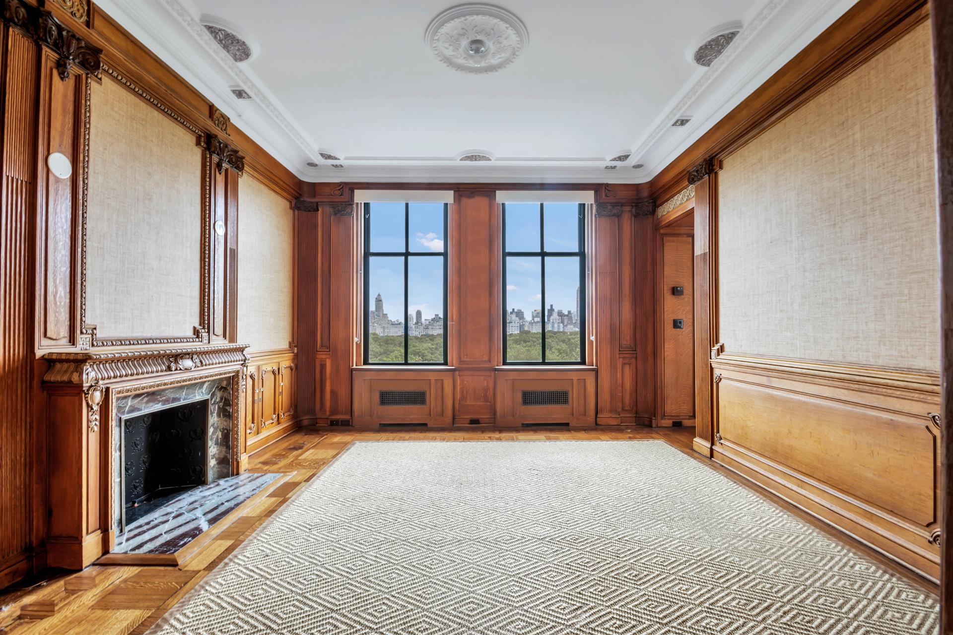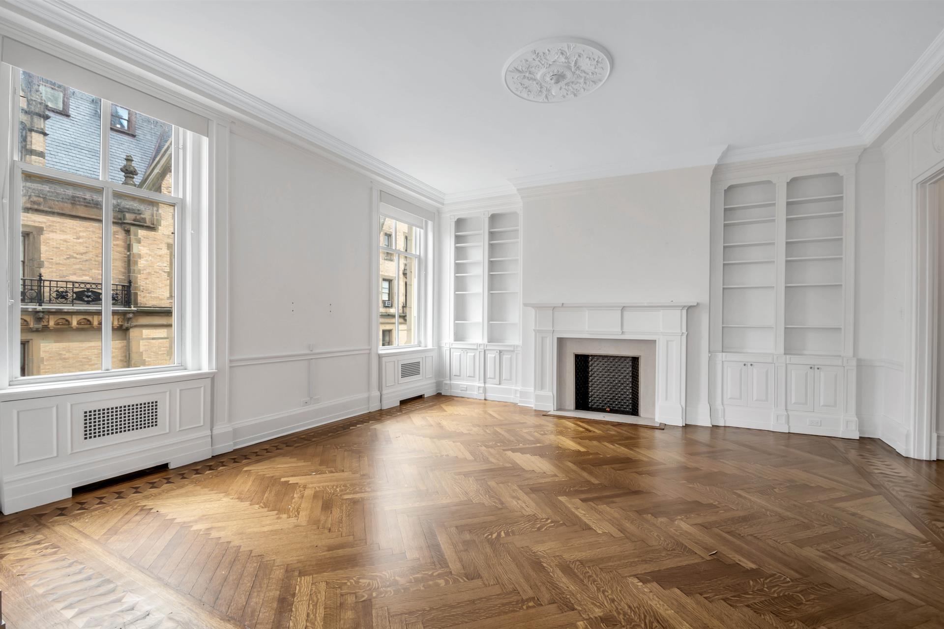 Stunning views over Central Park from the expansive living room of this nine room home. Pocket doors glide to reveal a formal dining room with original detail, as well as the beautifully appointed library, also facing over the park. The entry foyer is a grand welcome to this stunning 4 or 5 bedroom home. The prewar details are a perfect back drop to both classic or modern furnishings and art.