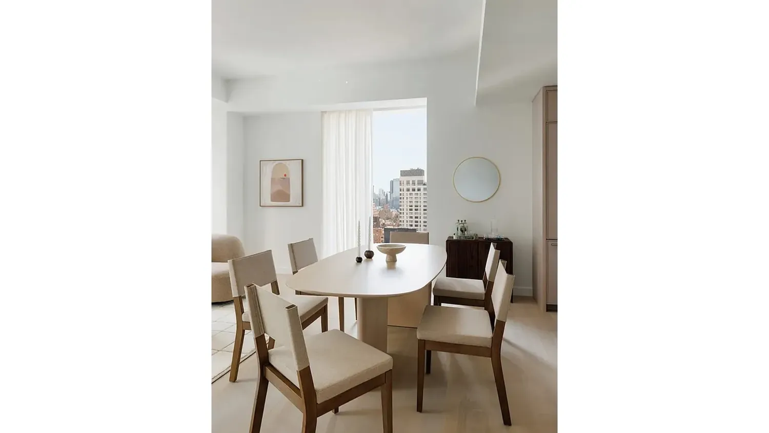 Perched on the 24th floor of the Centrale, this two bedroom, two and a half bathroom home offers North, South, and Eastern exposures through floor-to-ceiling windows. White oak flooring throughout leads from the entry into an open living and dining concept, complete with a chef's kitchen offering honed Capri marble countertops, backsplash, and a waterfall island with room for seating. The kitchen has a refined aesthetic with streamlined custom white oak millwork that seamlessly integrates a full Gaggenau appliance package, including an undercounter wine refrigerator, complemented by Dornbracht fixtures.