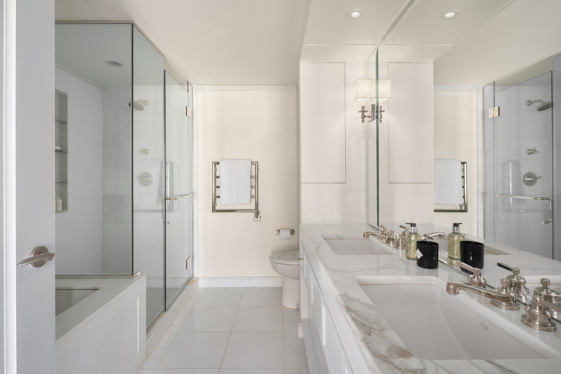 The spacious primary bedroom suite is filled with light, includes a large dressing room, and boasts a luxurious spa bath featuring a large rainfall shower, soaking tub, radiant heated floors, and double vanity, all clad in stunning white marble. The well-appointed secondary bedroom offers a floor-to-ceiling built-in bookcase, bright open views, generous closet space, and an en-suite windowed marble bath.