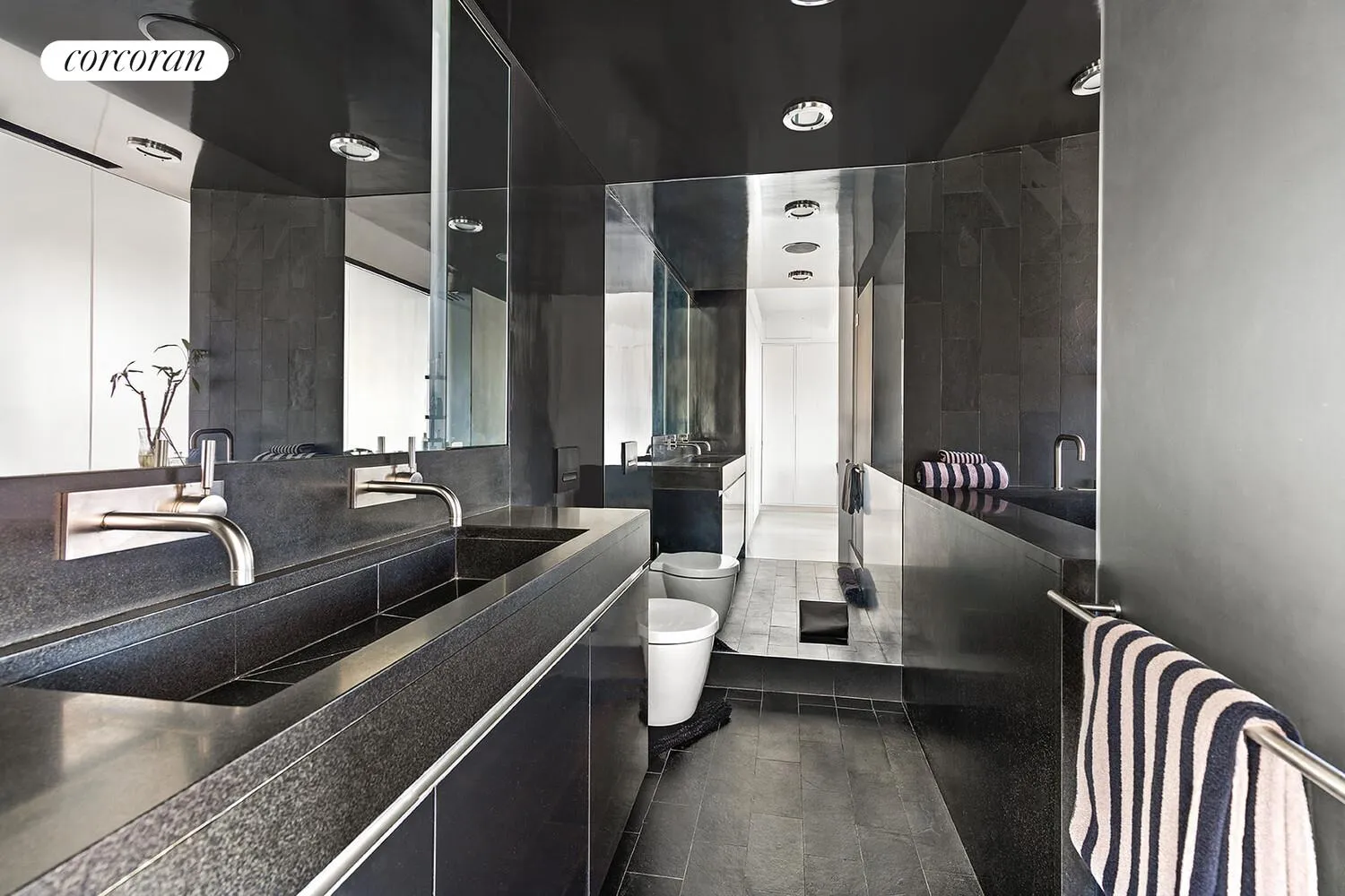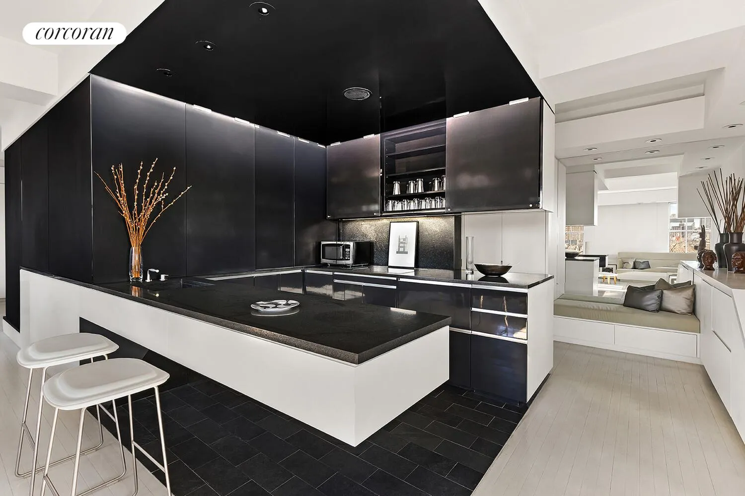 The kitchen and bath are finished in honed charcoal-gray granite, establishing a restrained, sculptural material palette. A floating island anchors the open kitchen, which remains connected to the living space and is equipped with high-end European appliances discreetly concealed within custom millwork. The oversized granite bathroom features a deep Japanese soaking tub, offering a serene, spa-like retreat. Split-zone air conditioning ensures comfort year-round.