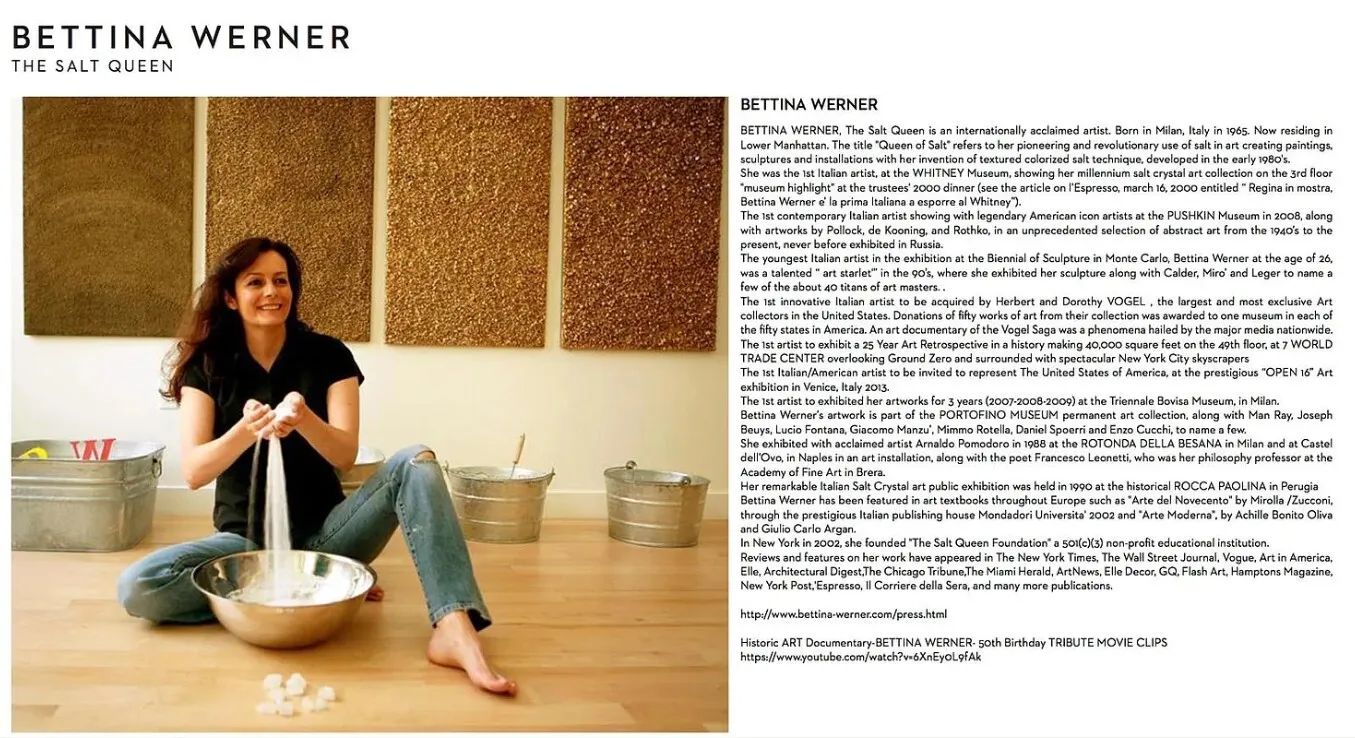 Beyond its architecture, the residence carries a rare artistic provenance. For more than two decades, the loft served as the creative studio and home of pioneering Italian-American artist Bettina Werner-known worldwide as "The Salt Queen"-who invented the first use of colorized salt as an artistic medium. Her internationally exhibited works imbue the space with a distinct creative energy. In many cultures, salt symbolizes blessings, prosperity, and fertility.