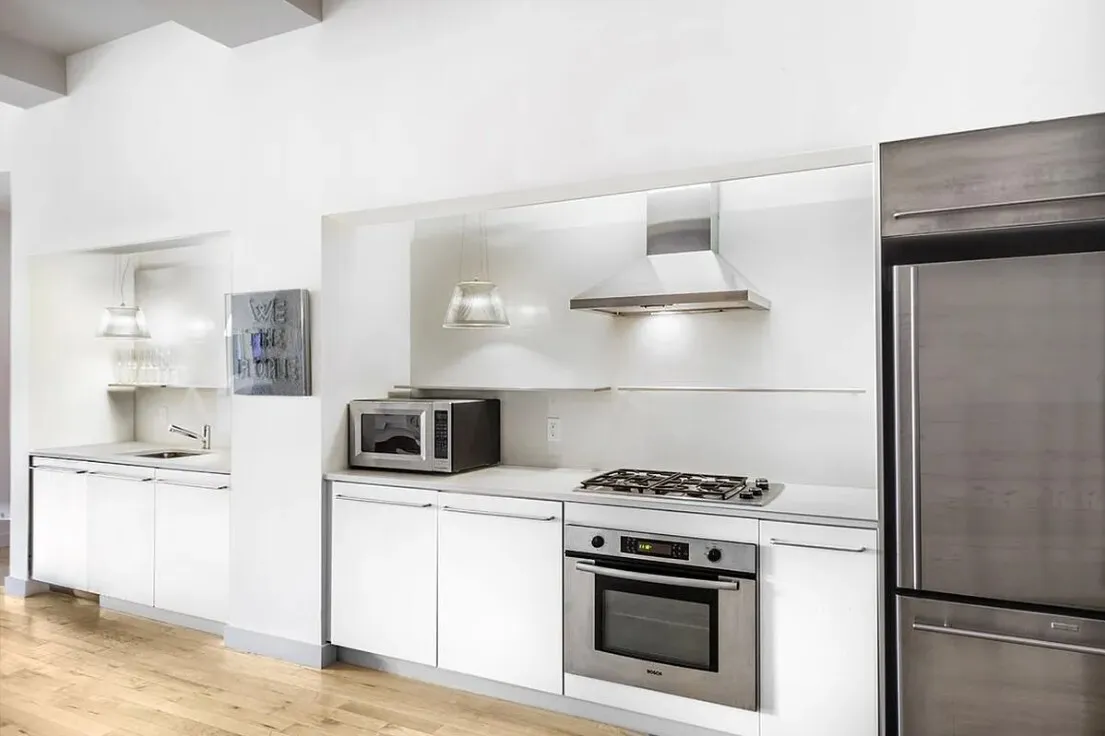 The open Philippe Starck-designed chef's kitchen features sleek custom cabinetry, white quartz countertops, and top-tier Bosch appliances, with ample storage and the option to add a substantial center island. The kitchen flows seamlessly into the living space.