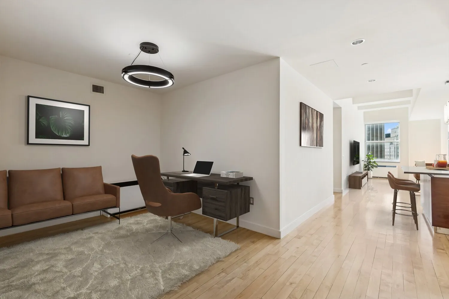 Perched high above the Financial District, Residence 2822 at 15 Βroad Street is a sun-drenched 1-bedroom, 1-bathroom plus home office that offers a sophisticated blend of historic architecture and modern luxury. With soaring 11-foot ceilings and coveted southern exposures, oversized windows fill the residence with natural light and open-sky views throughout the day.
