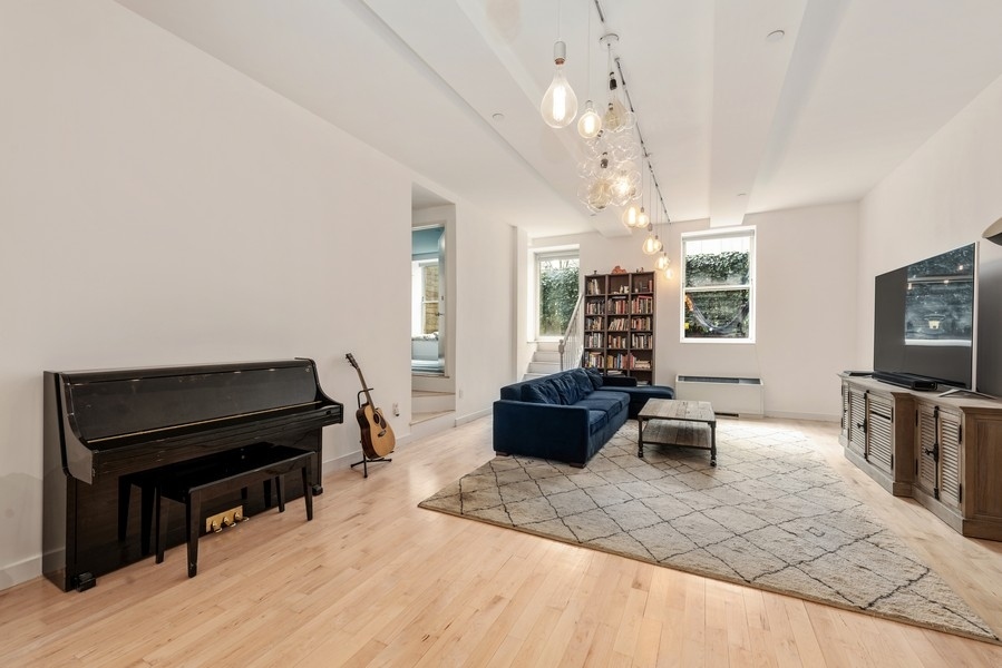 The sun-splashed expansive living space features recently-refinished hard wood floors, 12' beamed ceilings and central air conditioning. At the front of this great room is a well-appointed open kitchen, featuring quartz countertops, a Miele range and a Bosch dishwasher.