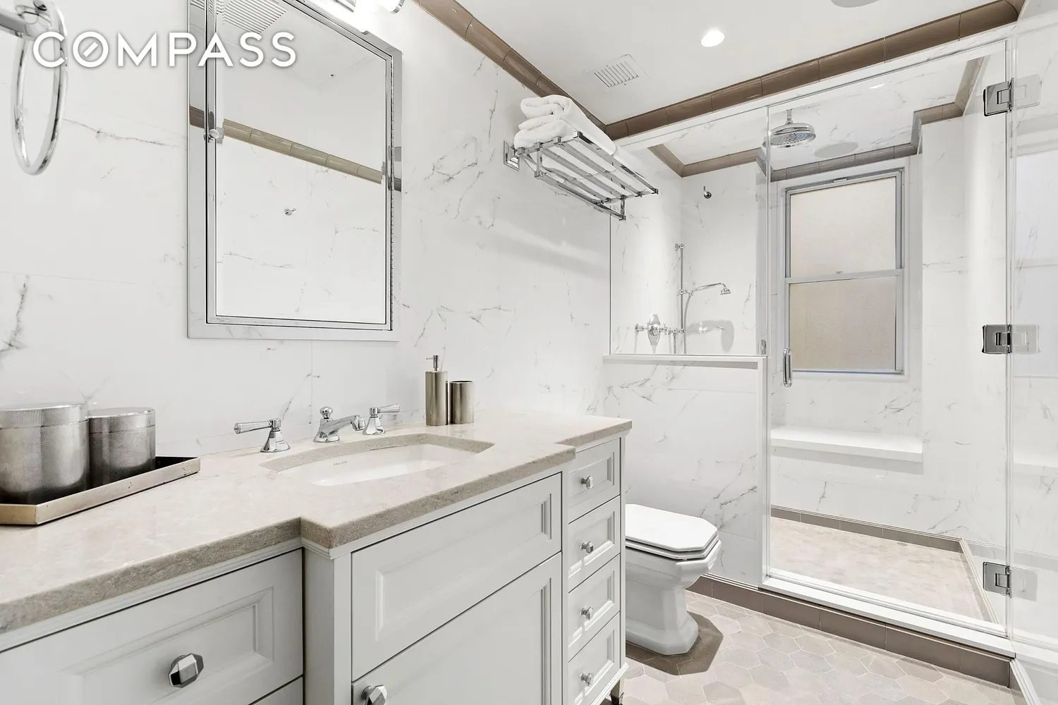 The primary suite is nothing short of exceptional, offering quiet, sun-filled southern courtyard exposures and a dressing room worthy of a couture atelier. The spa-like primary bath features a luxurious blend of floor-to-ceiling marble and Caesarstone, a spacious walk-in shower, dual custom solid wood vanities, abundant storage, and indulgent heated floors.