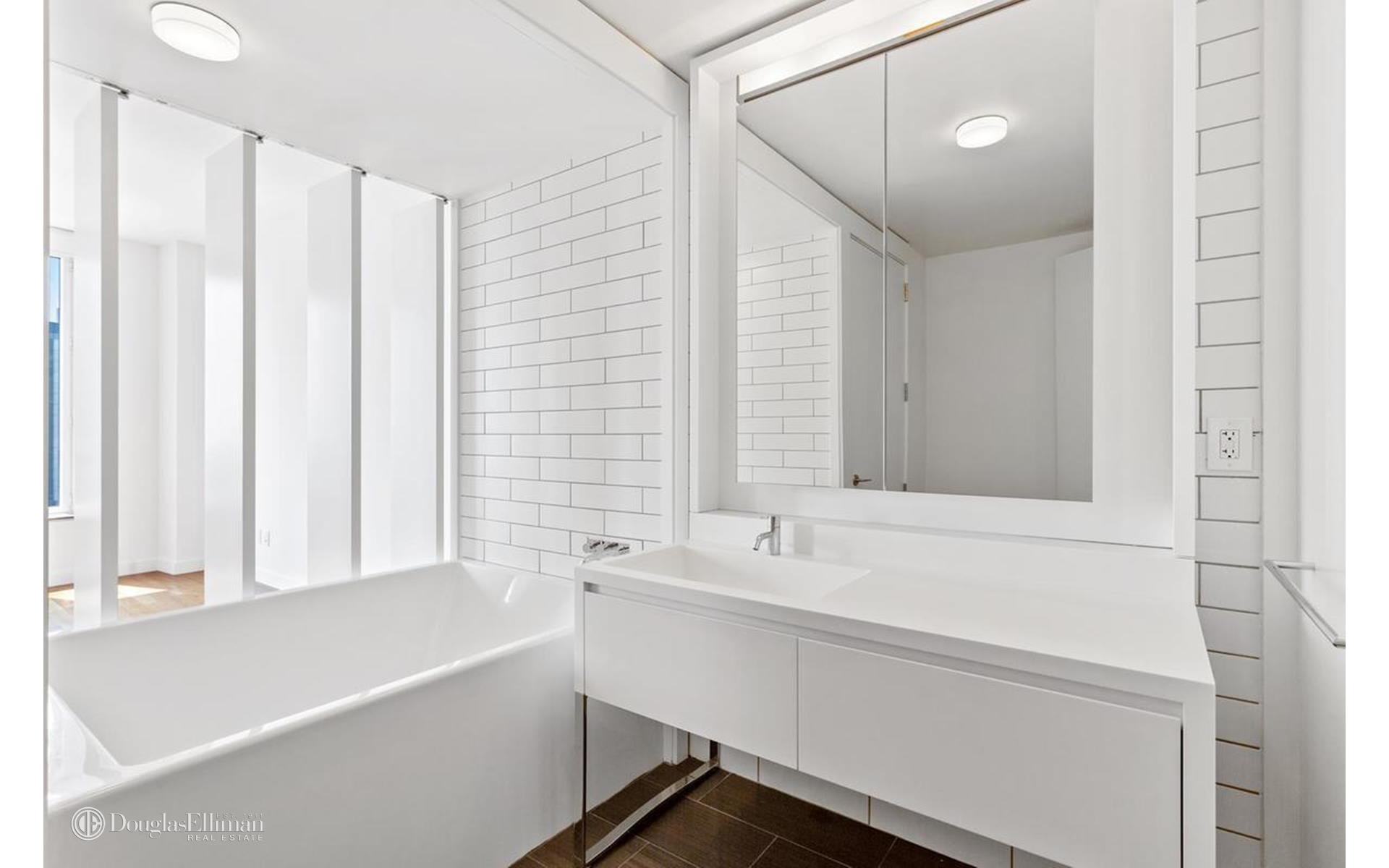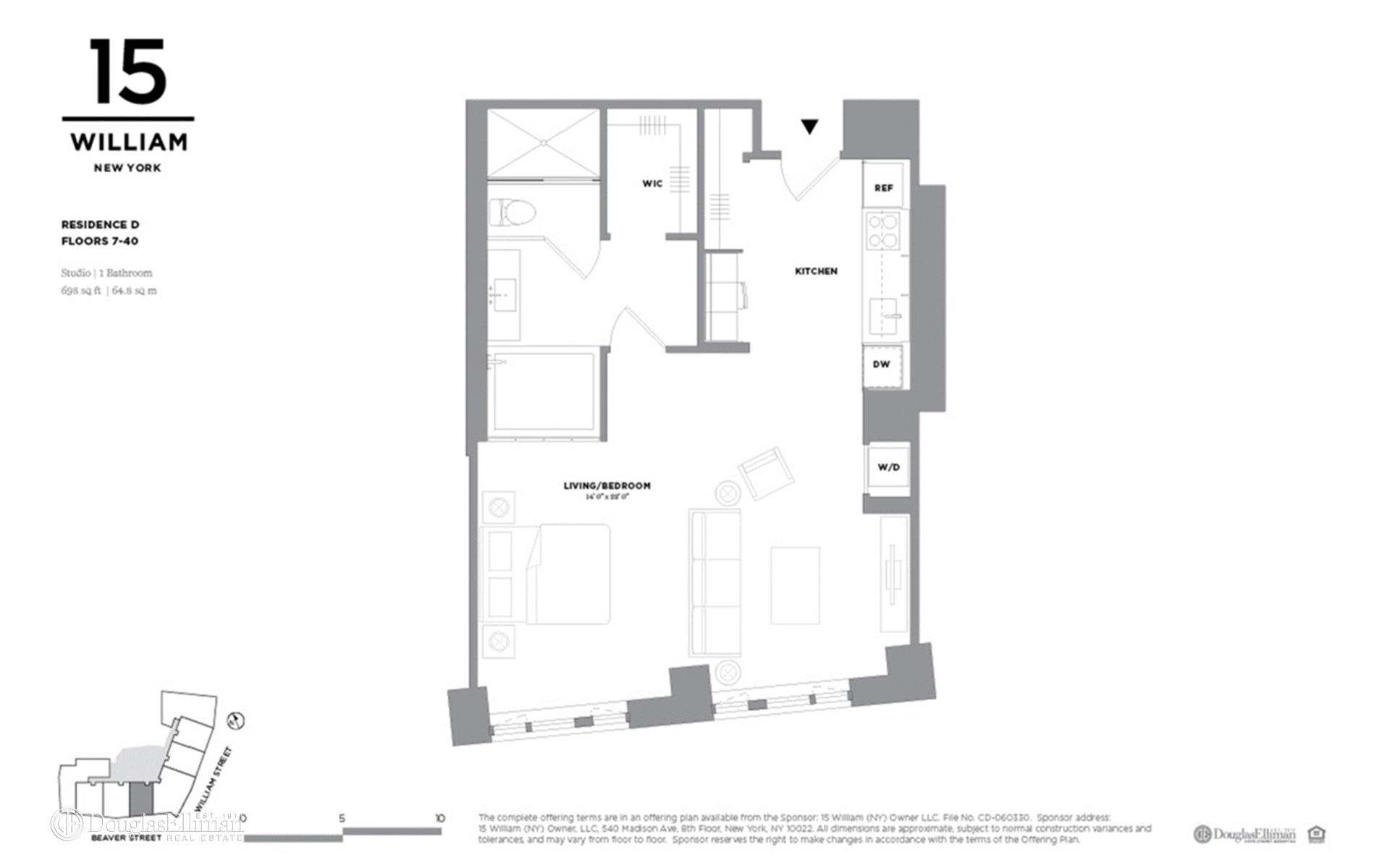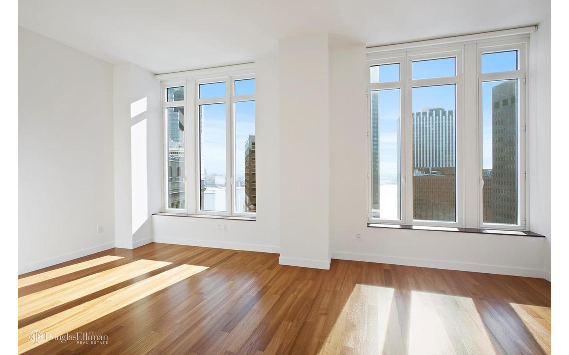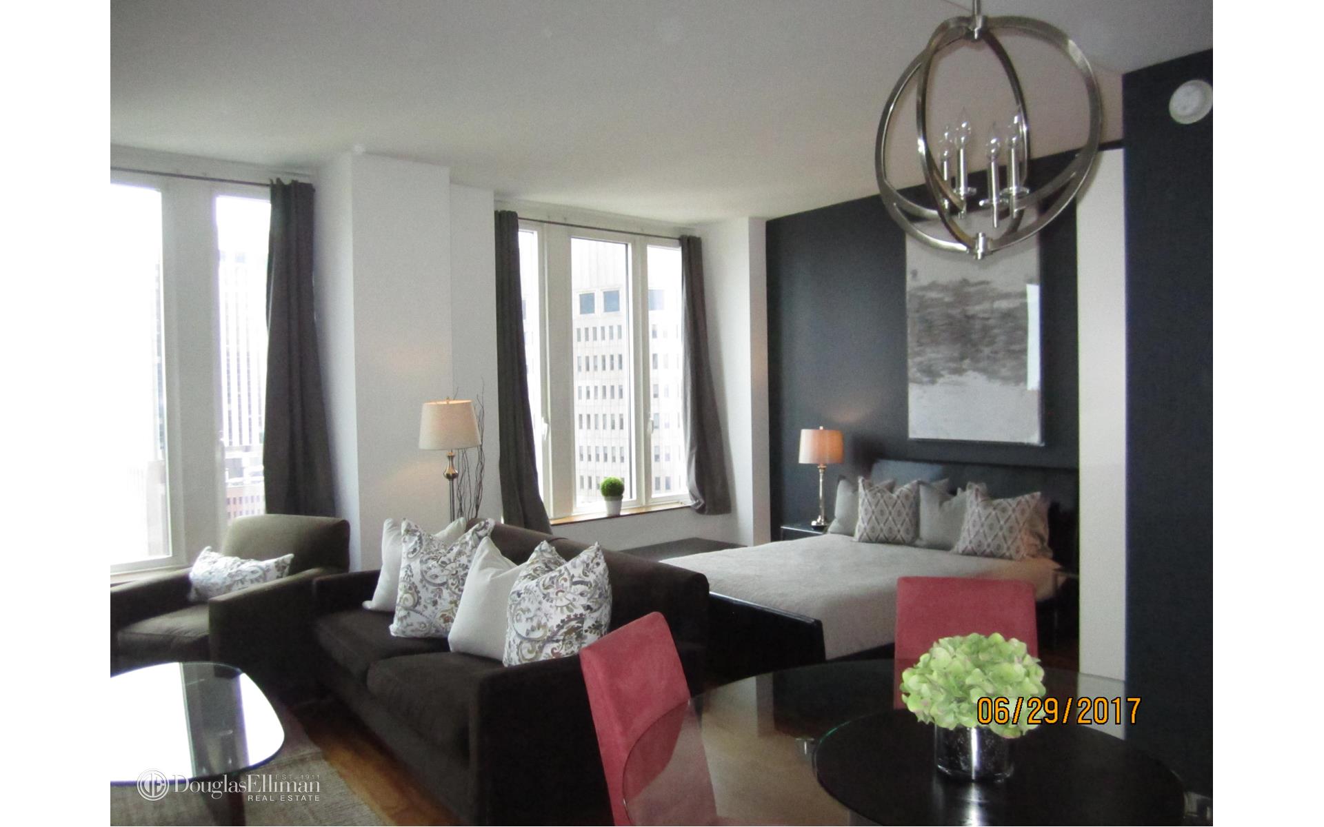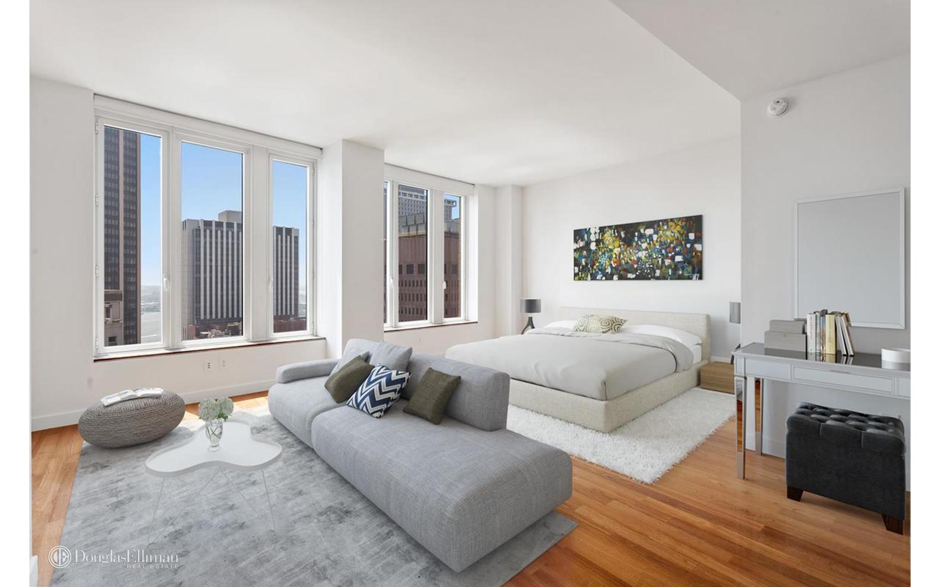 15 William is a modern and sophisticated condominium residence. It is distinctive and contemporary from the outside; modern, warm and inviting on the inside, with lifestyle amenities rivaling New York's finest residential buildings and luxury hotels.This smart and efficiently designed alcove studio, D-line residence, measuring a spacious 698 square feet, offers great views of downtown New York's iconic architecture and stunning water views. Beautiful light pours in through the expansive double-glazed 8'2" windows with southeastern exposures overlooking historically landmarked streets.The loft-style residence begins with an Entry Foyer that flows to an open Kitchen and then into the expansive Living Area with spacious Alcove. Adjacent to the Kitchen is a custom built-in home office that maximizes space and can easily be concealed. The chef's Kitchen boasts custom designed white lacquer and stainless steel cabinetry, Ceaserstone counter and backsplash and Blanco stainless steel sink with Vola satin nickel faucets. The high-end appliances include fully-integrated Liebherr refrigerator/freezer and Miele Incognito dishwasher, as well as Miele gas cook top and convection oven. Additional features include integrated stainless steel hoods, dimmable cabinet lighting, as well as garbage disposal.Indulge in the well-appointed Master Bath with exquisitely crafted custom Corian vanity with mirror surround, generous double medicine cabinet with integrated lighting, oversized deep soaking tub, and a separate rain shower and Toto Carolina water closet enclosure.This sleek, contemporary residence features 9'8? ceiling heights, warm Burmese Teak flooring throughout, a built-in home office, Asko washer/dryer, multi-zone climate control system providing heat and AC all year round, high-speed internet, cable television and abundant storage and closet space.Unrivaled amenities include a stunning resident's penthouse lounge with wraparound landscaped terrace, private children's playground, professional screening room, covered dog run, onsite valet parking and Abigail Michael's concierge services. Nearly 18,000 square feet of space is devoted to fitness and exercise including a natural-light filled fitness center with state-of-the-art strength and cardio equipment, indoor 50' heated salt water lap pool, outdoor hot tub, sauna and steam rooms, outdoor half-court basketball, indoor squash court and yoga studio.Perfectly situated, 15 William Street is a ground-up 320 unit, 47-story luxury high-rise in the heart of the Financial District, surrounded by architectural jewels of the past centuries, chic shopping destinations, sumptuous dining, and all that Downtown's most exciting neighborhood has to offer. Residents also enjoy quick access to many transit options: 2,3,4,5,6,R subways, bus routes, PATH, Citi Bike stations and NY Water Taxi.