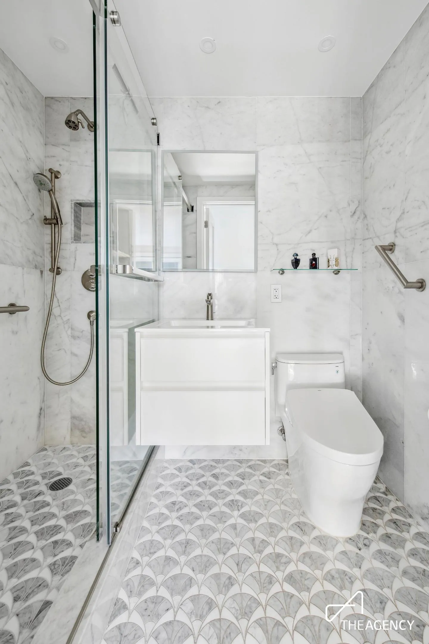 New 7" wide plank floors subtly introduce you to a huge walk-in closet with birch shelving and details, and then the dining and living areas as you head toward the wall of new windows beyond. Then turn to the alcove with its most unique and sensible custom Murphy bed that transforms from a desk by day to an easily opened but substantial Queen bed by night, with lighting and tons of storage. Pass another closet and a dressing area (with a custom vanity/makeup table), and enter the upscale bathroom with its stall shower, mother of pearl and quartz vanity, medicine chest with dual outlets and USB ports, and, yes, a Toto Washlet toilet/bidet (also remotely operated :). The doors and the brushed nickel hardware throughout are new, and the remote shades and lighting deliver the appropriate mood at a touch.
