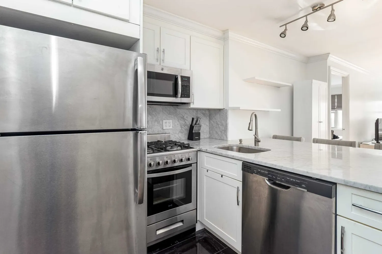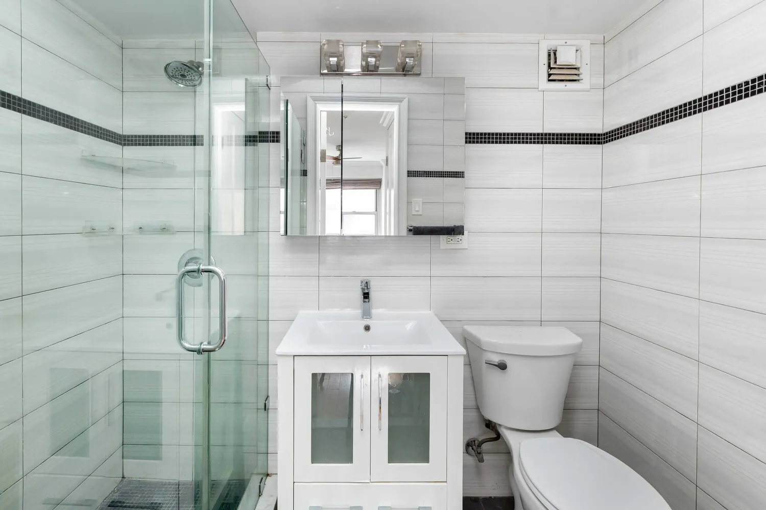 This spacious one-bedroom home has been thoughtfully renovated and features a new open kitchen with Carrera granite countertops, a breakfast bar, and full-size stainless steel appliances. The expansive dining and living area is light-filled and airy, enhanced by solid hardwood floors, crown moldings, and recessed lighting. The bedroom comfortably accommodates a queen-size bed with space for additional furnishings, while the renovated bathroom showcases floor-to-ceiling tile and a custom glass shower enclosure. Ample closet space throughout ensures easy organization and functionality.