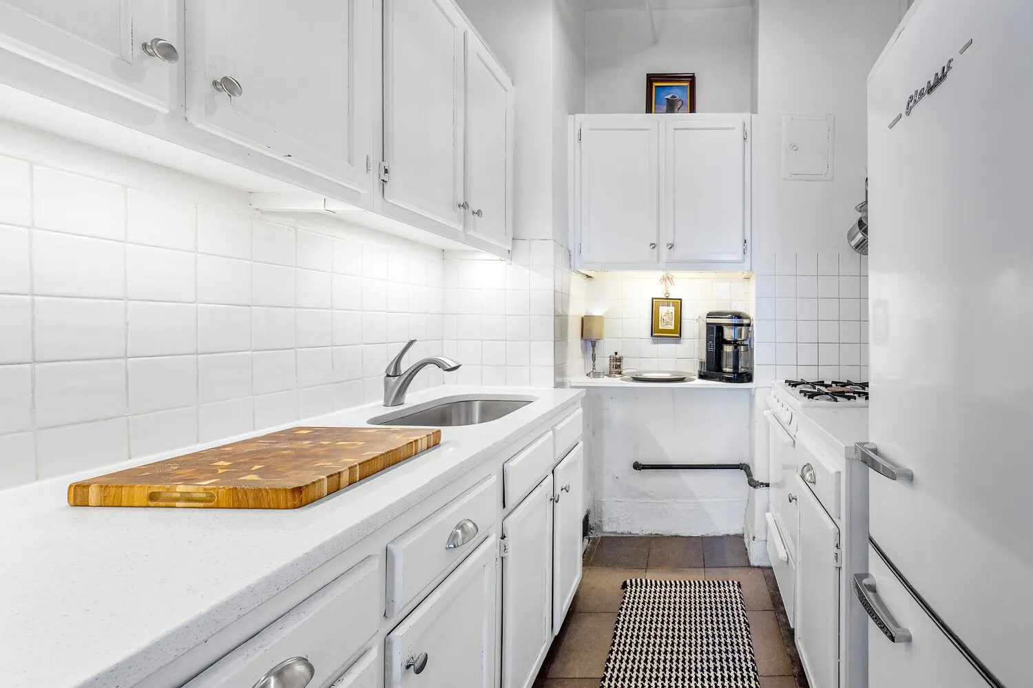 The galley kitchen is efficiently designed with gas range, generous cabinetry, and the opportunity to customize or open further.