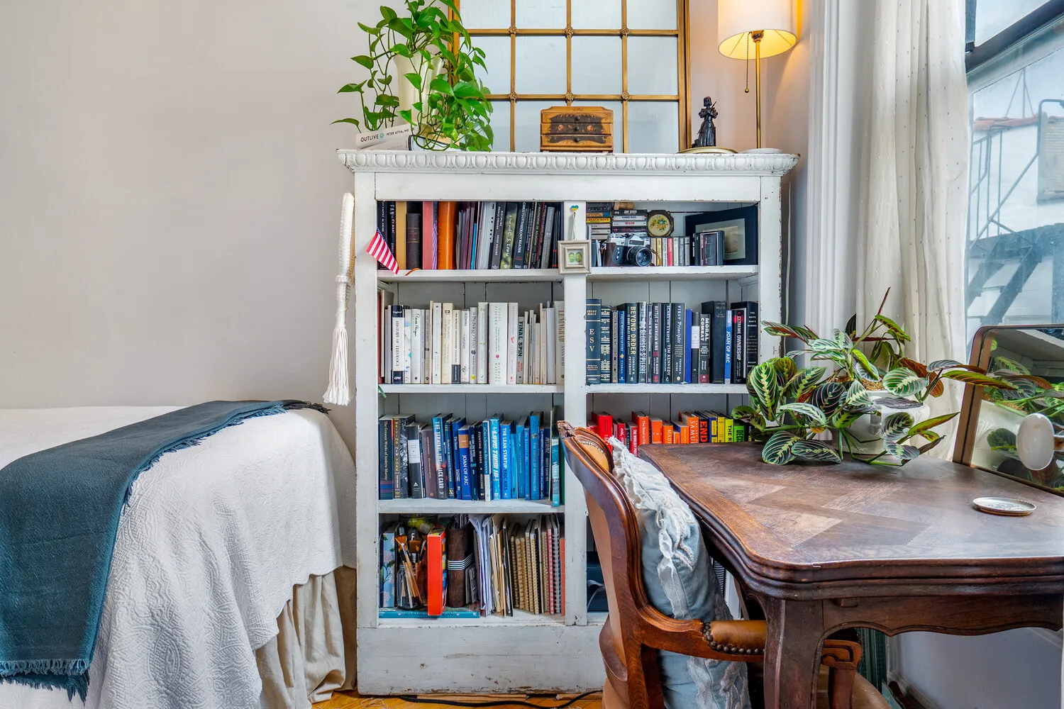 Quietly positioned, the bedroom is well-proportioned and filled with natural light, offering space for a complete bedroom setup along with additional storage or workspace.