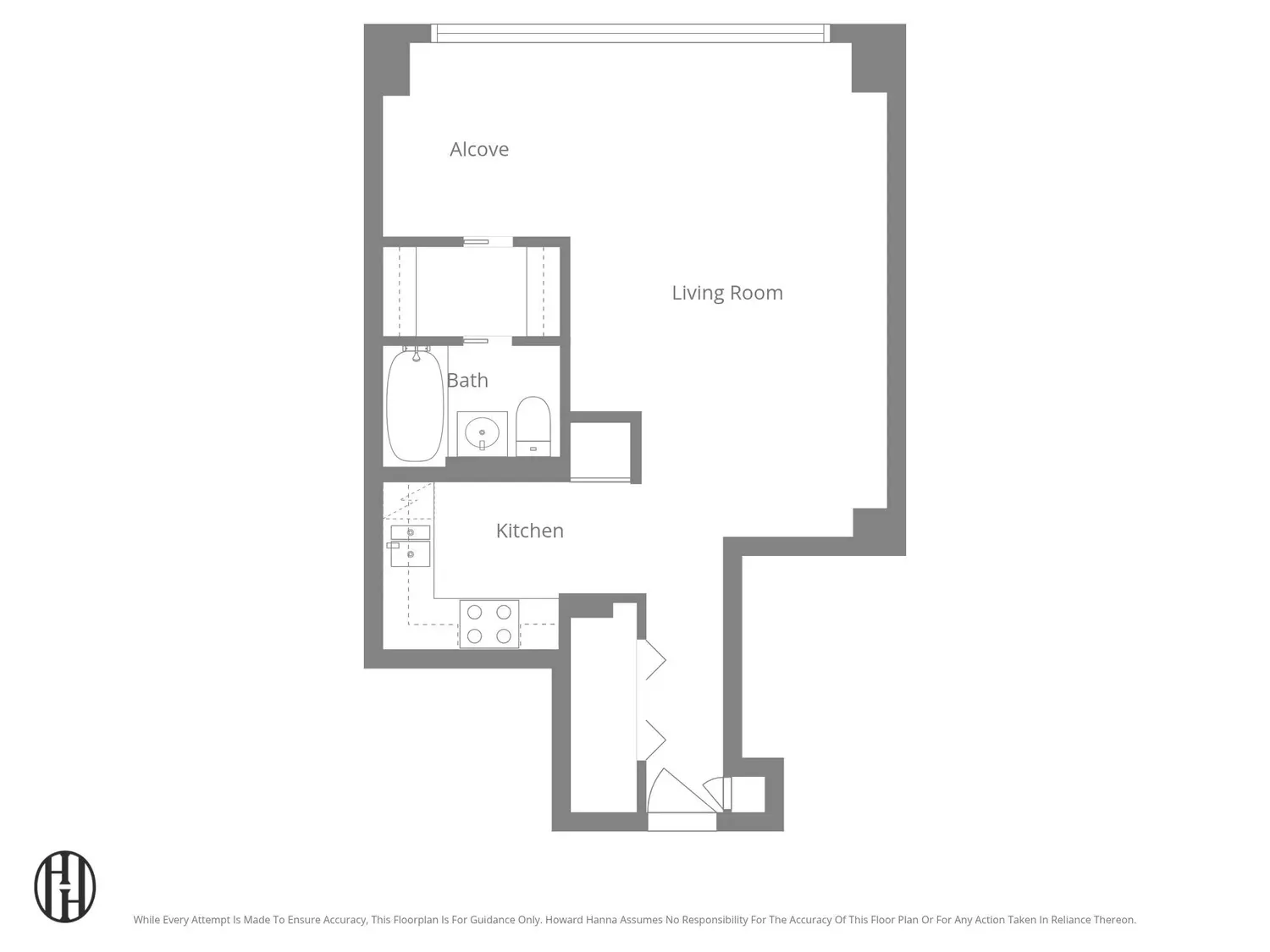 Upon entering, the apartment opens to a smart, well-defined layout that maximizes space and flow. The alcove design creates a separate sleeping area while maintaining an open living and dining space.