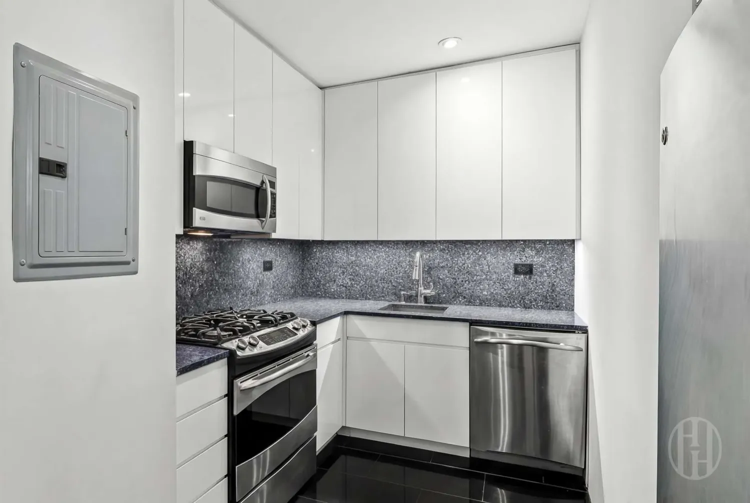 The open kitchen features stainless steel appliances, stone countertops, and ample cabinetry, seamlessly integrated into the living area.