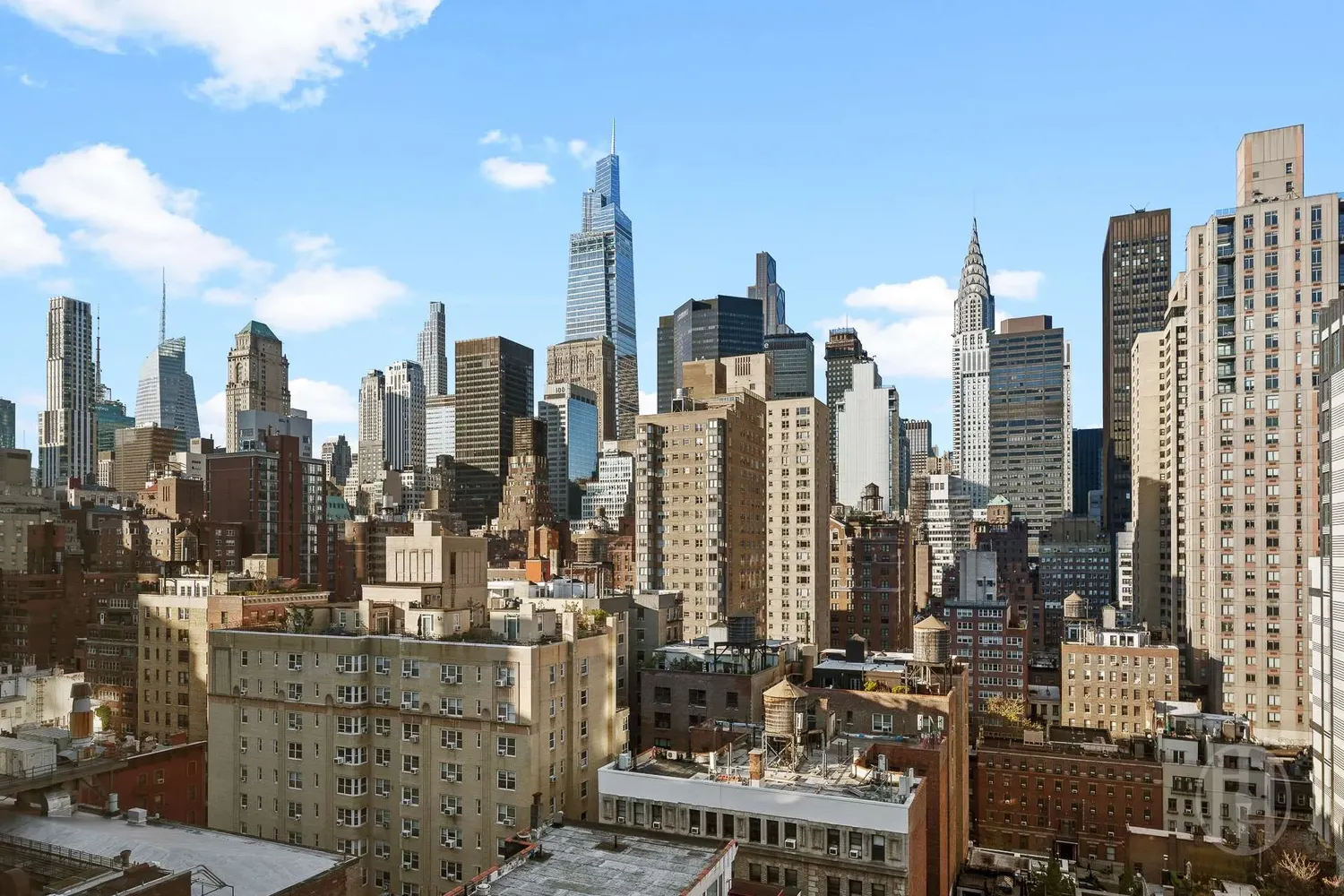 Large windows bring in natural light and showcase open city views, including the Chrysler and MetLife Buildings and the surrounding Manhattan skyline.