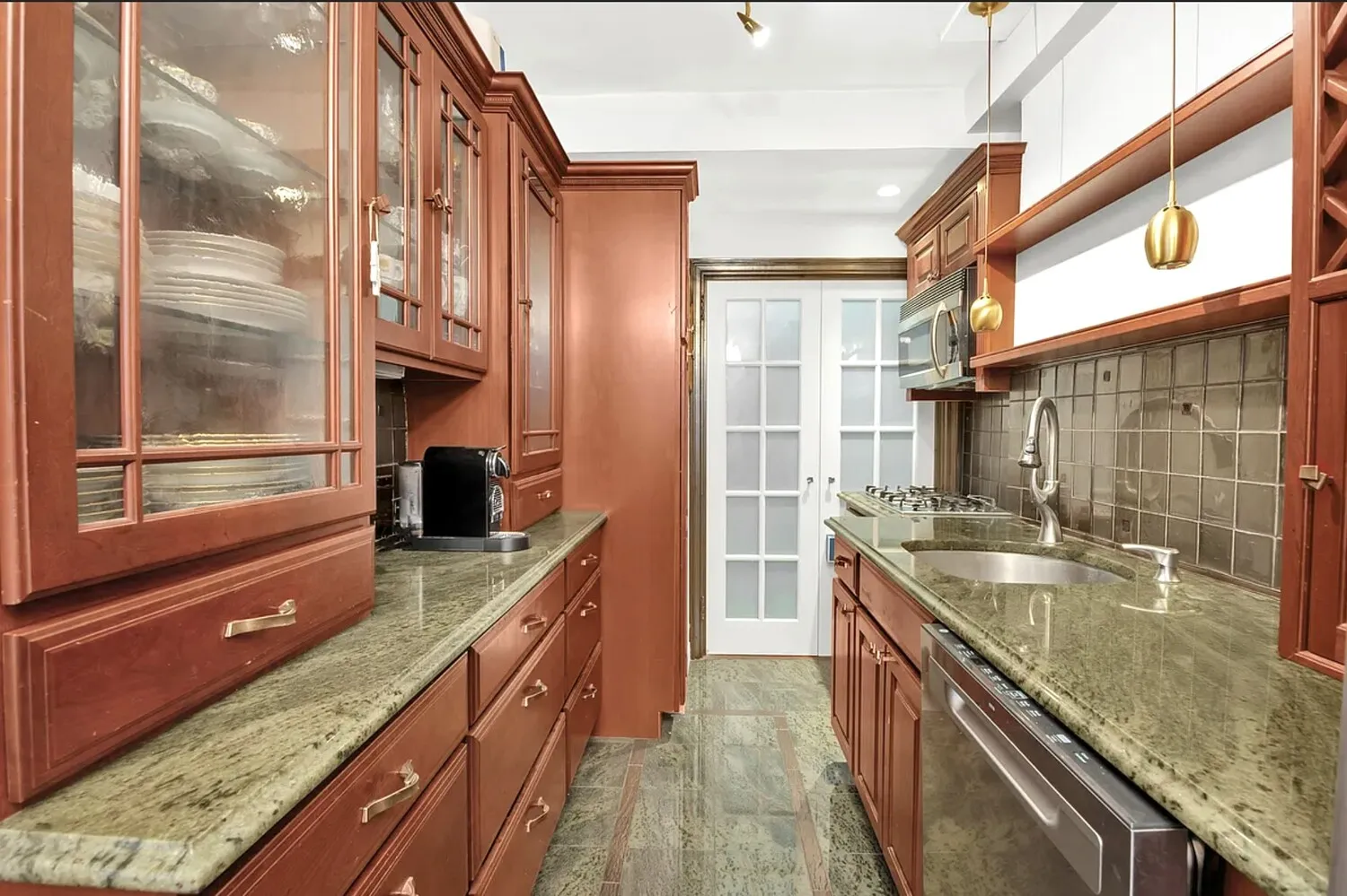 The updated kitchen has high-end wood cabinetry with glass shelving, marble countertops and floors, and new stainless-steel appliances. A separate dining area easily fits a table for six or can double as a comfortable home office.