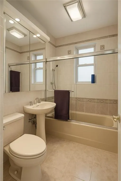 The windowed bathroom includes a full-size tub, stylish tiling, and a convenient linen closet.