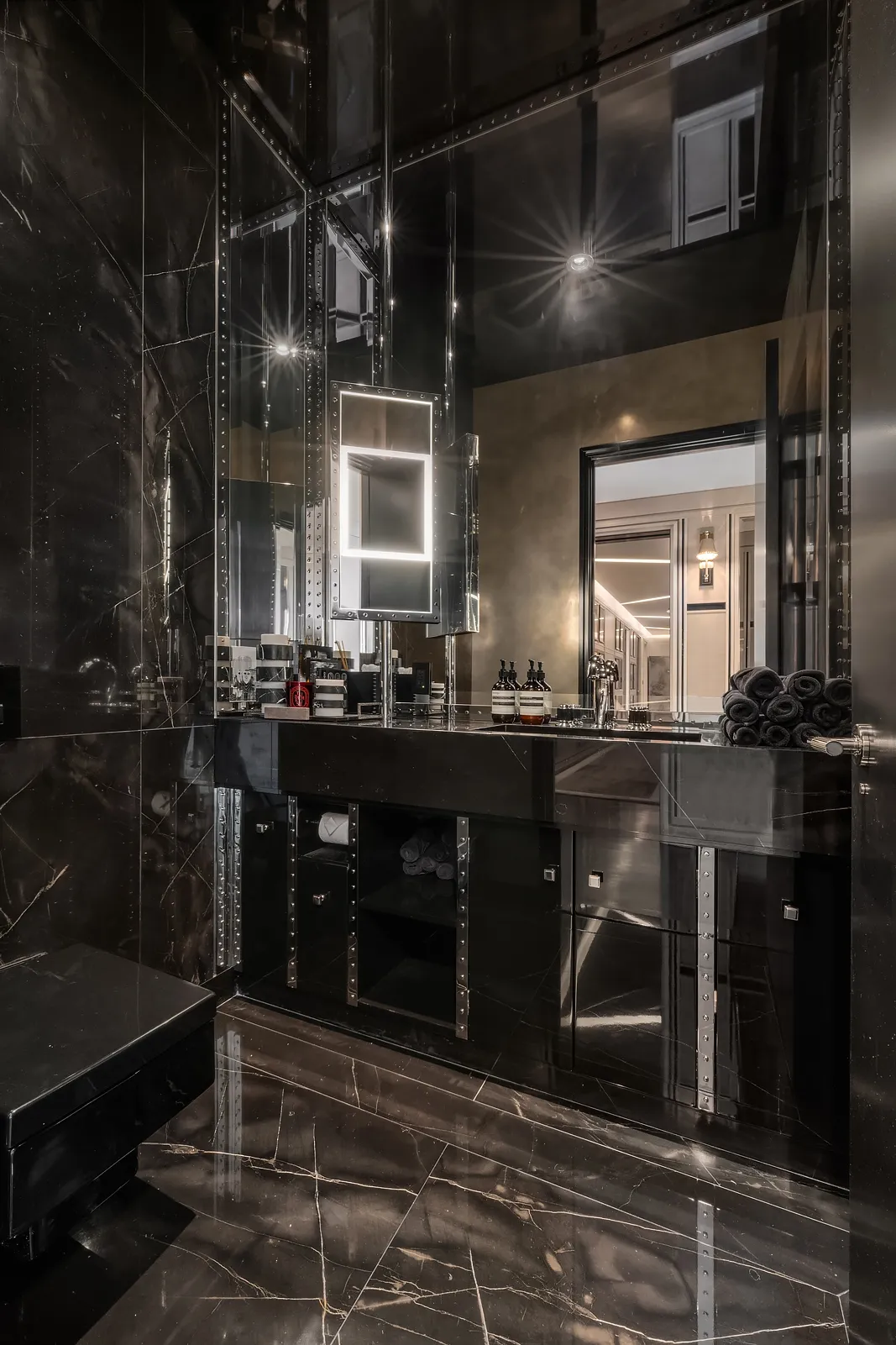 The apartment has a unique floor plan with separate formal and family areas and private areas for staff, guests, children and master. Separated by a long Cerused Oak paneled gallery, the private quarters represent the epitome of discreet elegance. The bright, expansive primary suite boasts three walk-in closet/dressing rooms and a chic northeast facing sitting area. With floor-to-ceiling windows, the lavish marble-clad primary ensuite bathroom sits on the southeast corner and boasts an oversized soaking tub, stunning separate rainshower, a proper Finnish sauna, steam room and treatment room.