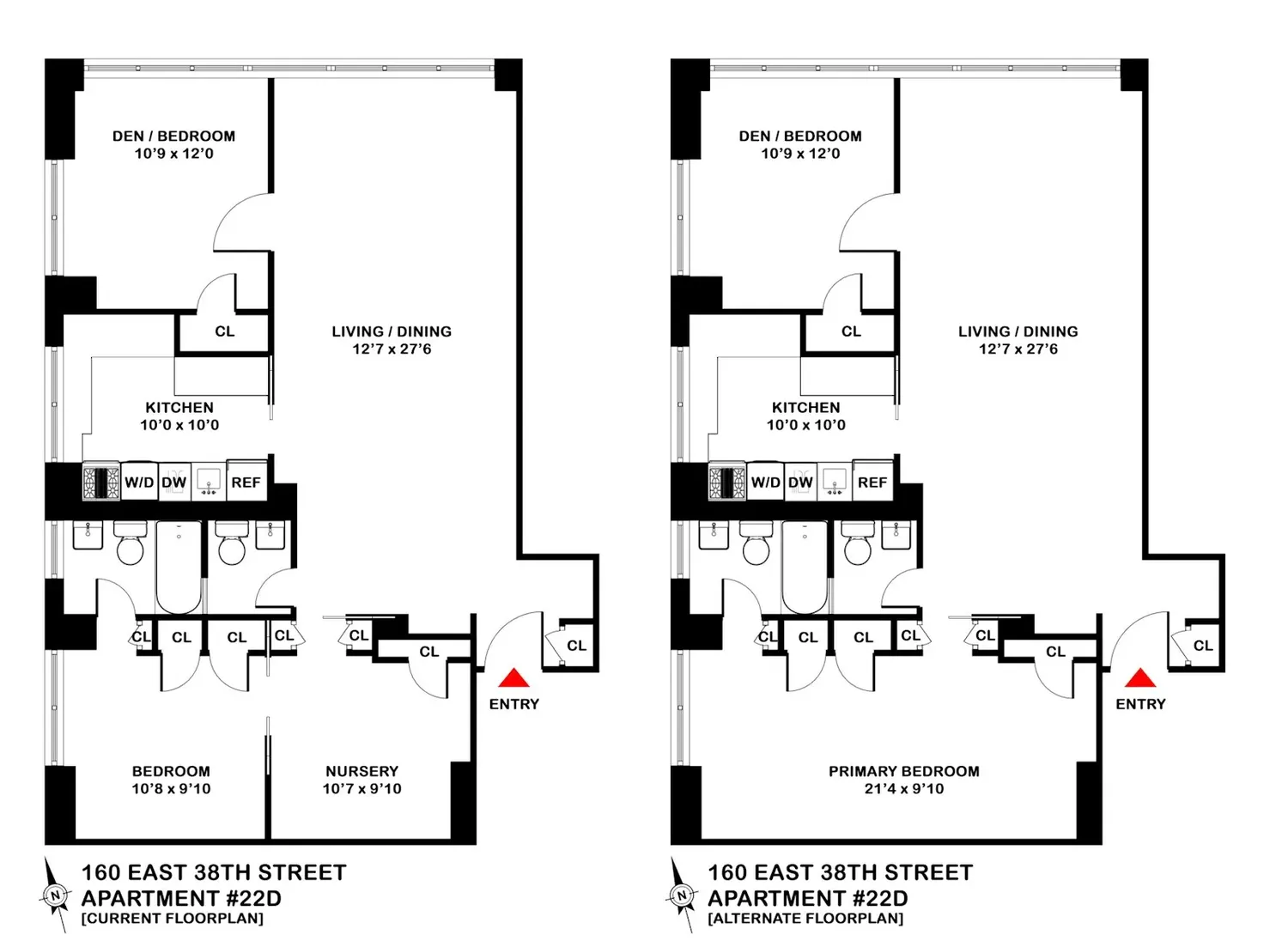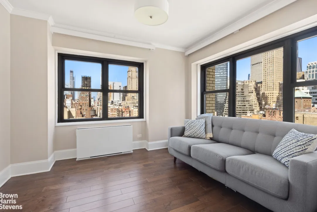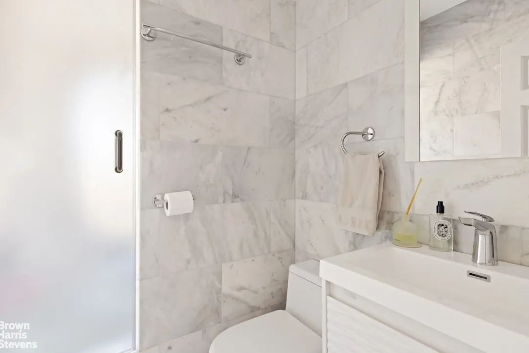 This high floor spacious two bedroom, one and a half bath home has been totally transformed, with no details spared. An inviting home features an entry foyer that leads to a dining area and very spacious living room with great light and northern cityscape views. Watch the lights change color at the Empire State building from the den or 2nd bedroom as well as the double windowed kitchen, and windowed primary bedroom with amazing western views. The beautifully renovated and well-designed kitchen has custom cabinetry, quartzite countertops and backsplash, stainless appliances, washer/dryer and a breakfast bar to sip your coffee while taking in the views. Both the primary bath and powder room are finished in Carrera marble with elegant fixtures and spa-like details including thermostatic controlled rain and hand held shower. Cleverly designed, your guests can access the bathtub from a door in the powder room. The primary bedroom is currently configured with a wall and pocket door that separates the sleeping area from a dedicated nursery. Easy to remove, it would fit a king sized bed and more. From the beautiful oak hardwood floors, pocket doors, custom lighting, thermostats in all rooms, decorative molding and plenty of closets, just bring your personal stuff and move on in!