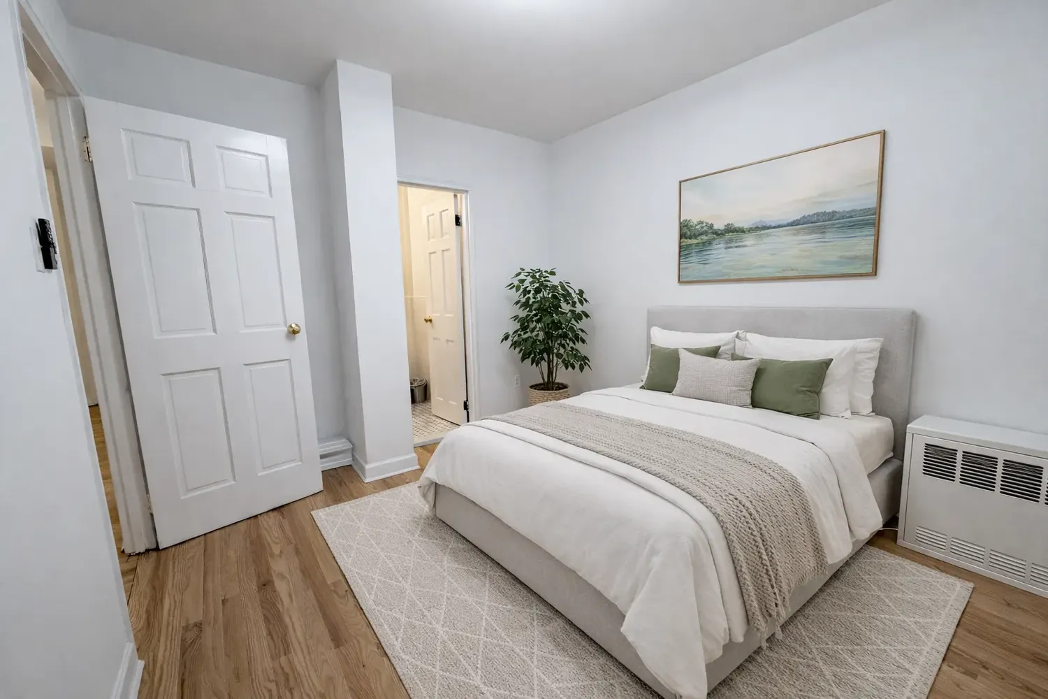 Upon entry there is a long corridor featuring a deep, up to ceiling, builtin coat closet. The long corridor leads on the left to a quiet, tucked away master bedroom with space for a Queen size bedroom and a small furniture, featuring a huge and high built in closet. The bathroom is accessible from that master bedroom, fully renovated with marble floor and counter top, a new vanity, medecine cabinet and fresh ligthting, a mint porcelain bathtub, spa rain shower, TOTO toilet and new subway tiling throughout.