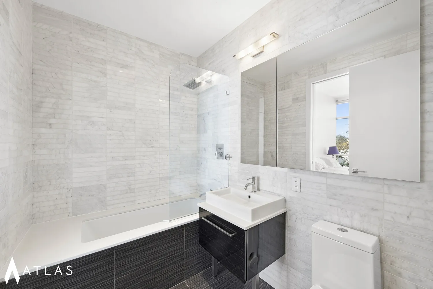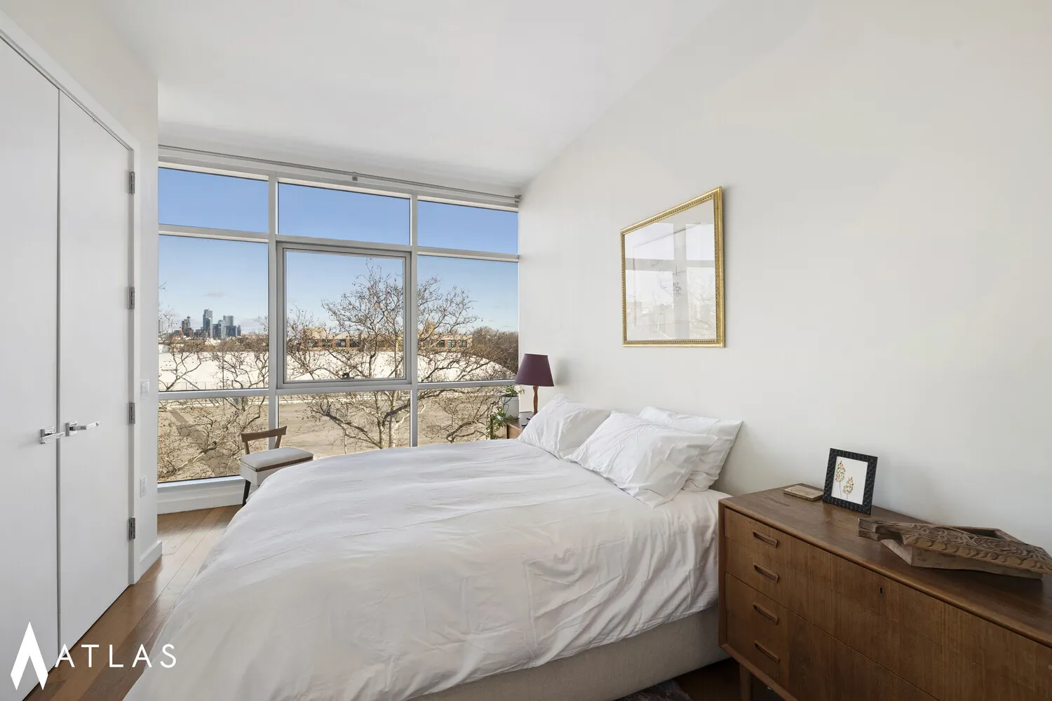 Nine-foot ceilings and solid Brazilian walnut floors enhance the sense of volume and continuity throughout the home, while floor-to-ceiling windows in both the living room and bedroom frame sweeping, permanent views of McCarren Park; an increasingly finite and irreplaceable asset. The open kitchen is outfitted with top-of-the-line Liebherr and Bosch stainless steel appliances, white quartz countertops, and custom cabinetry, balancing refined aesthetics with everyday functionality. Abundant natural light, open sightlines, and tranquil green vistas distinguish this residence from surrounding inventory.