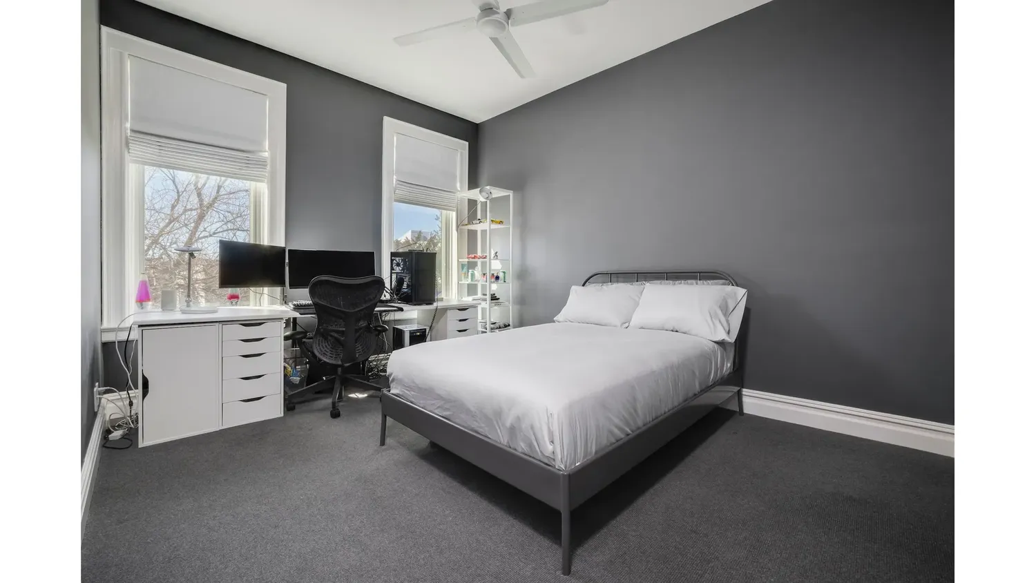 The upper level comprises a primary suite at the front, complete with a spa-inspired en-suite bathroom and a generous dressing room. Two further bedrooms are situated on this floor-one king-sized and another smaller in scale-as well as a full bathroom featuring elegant penny tiles and a soaking tub. The fully finished lower level provides a small kitchenette and a brand-new bathroom, with direct access from the exterior. This versatile space is well-suited for use as a home office, recreational area, or guest quarters. There is also the laundry/mechanicals and additional storage on this level.