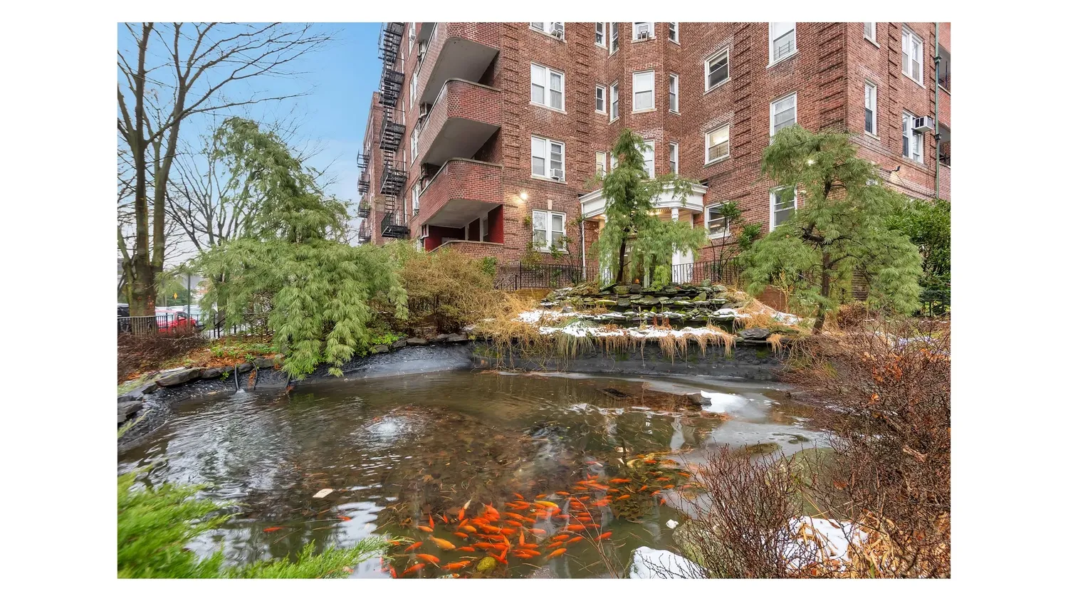 From the moment you arrive, the property sets itself apart. A dramatic landscaped waterfall and koi pond create a breathtaking first impression, welcoming you home with a sense of calm rarely found in New York City. The grounds feel more like a private garden estate than a typical residential complex.