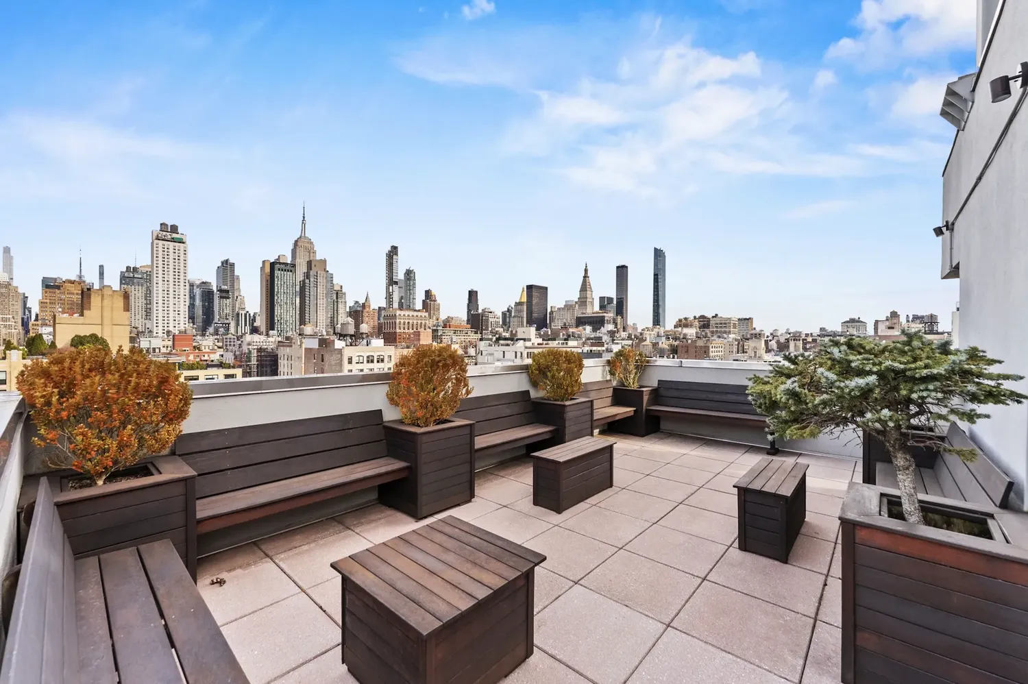 The king-sized primary bedroom features southern exposure and offers direct access to the furnished terrace, complete with a gas range, lighting, and irrigation — a rare and luxurious outdoor entertaining space. Functionality and design flow throughout the space, making this one of the best layouts in the entire building. The secondary bedroom includes an en-suite bath, and would also accommodate sized bed. Storage is abundant throughout the home, including 2 large walk-in closets. Additional conveniences include central A/C throughout and an in-unit Bosch washer/dryer.