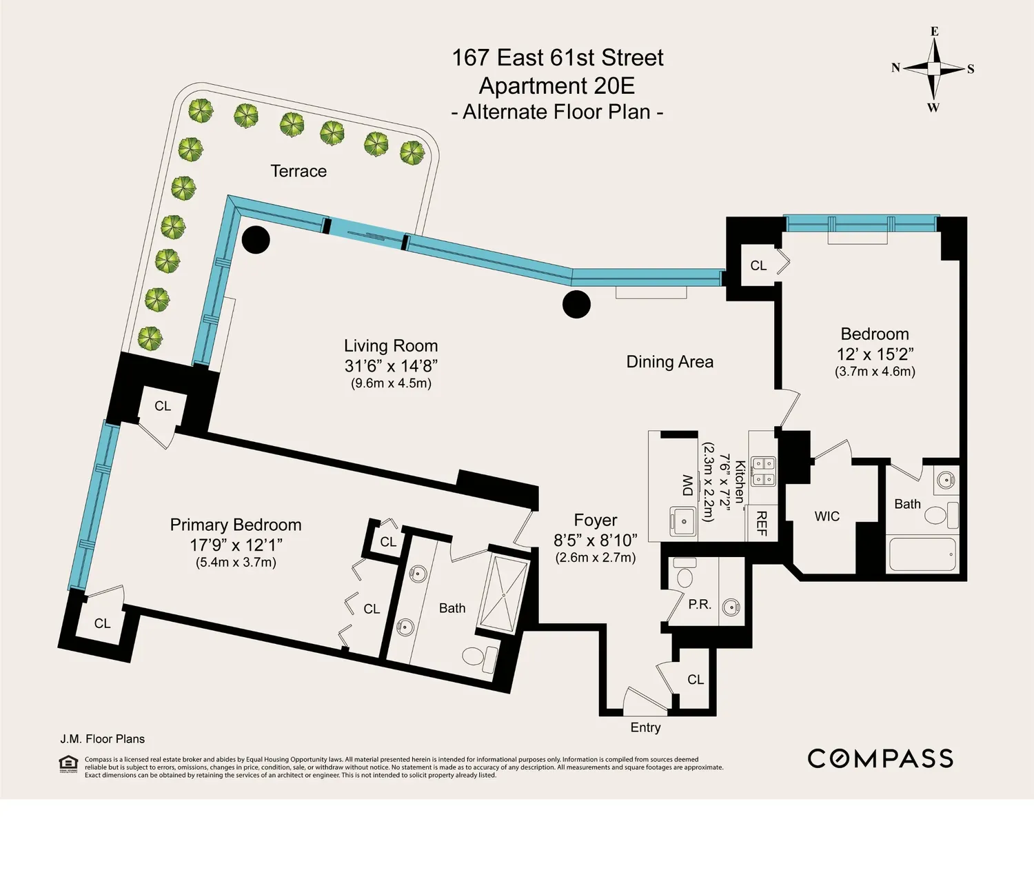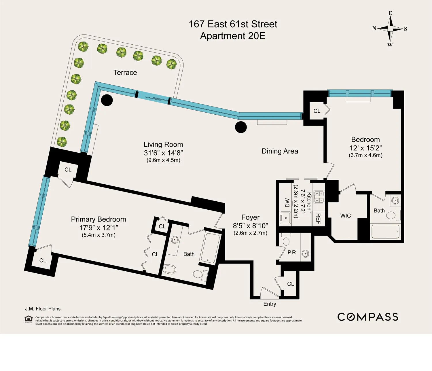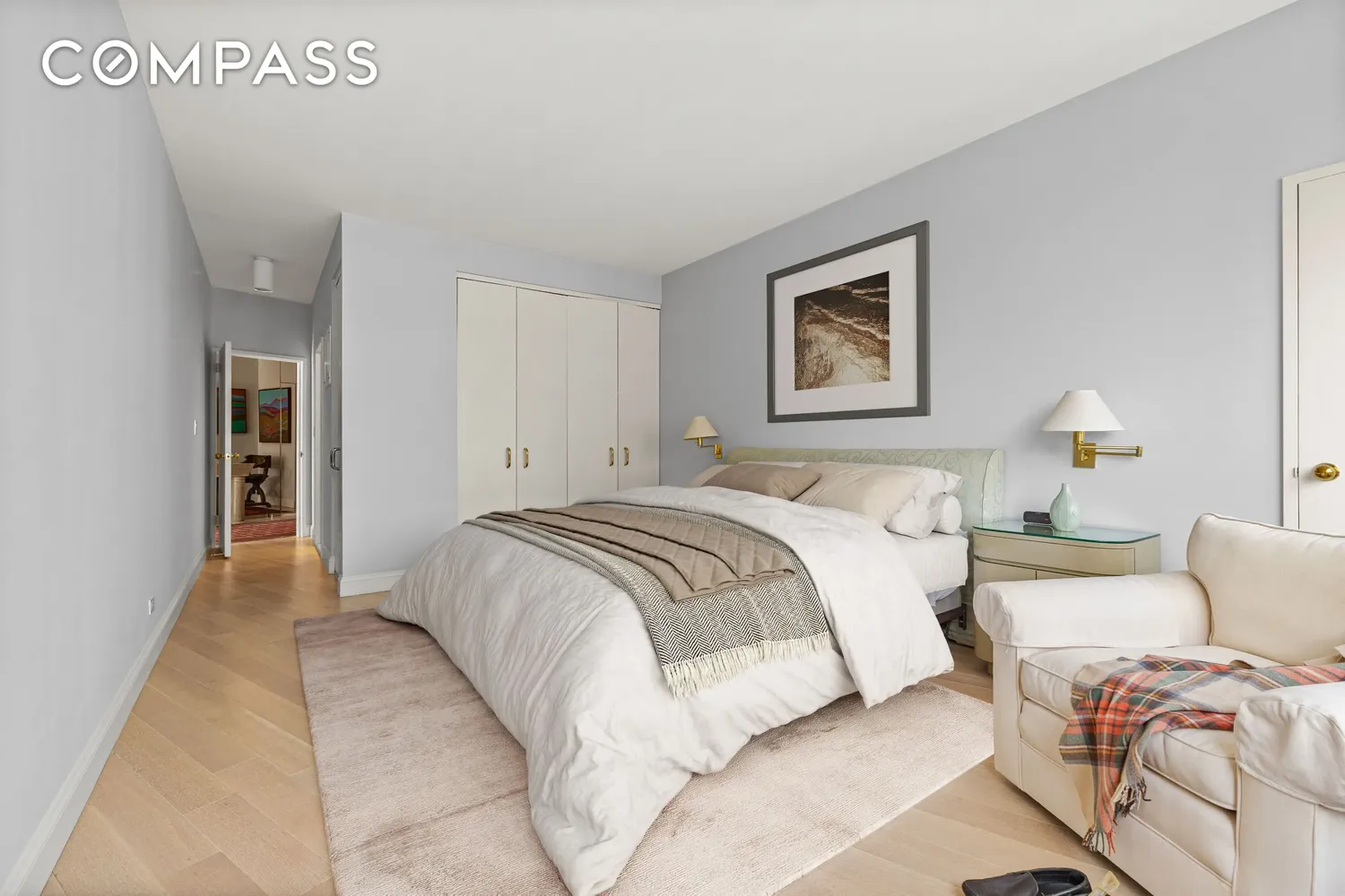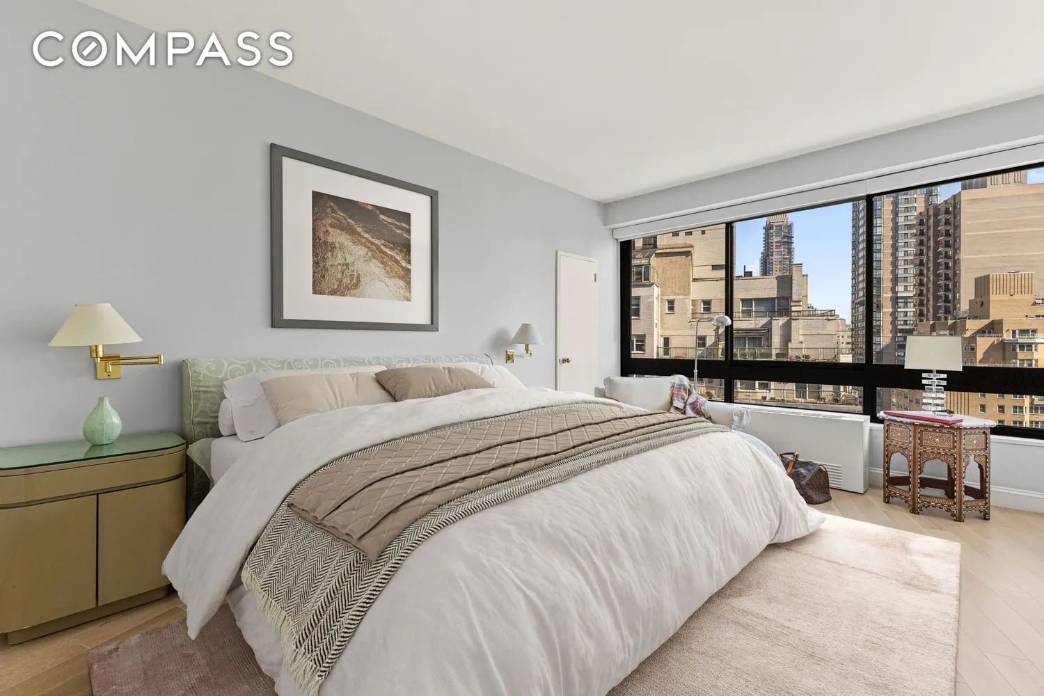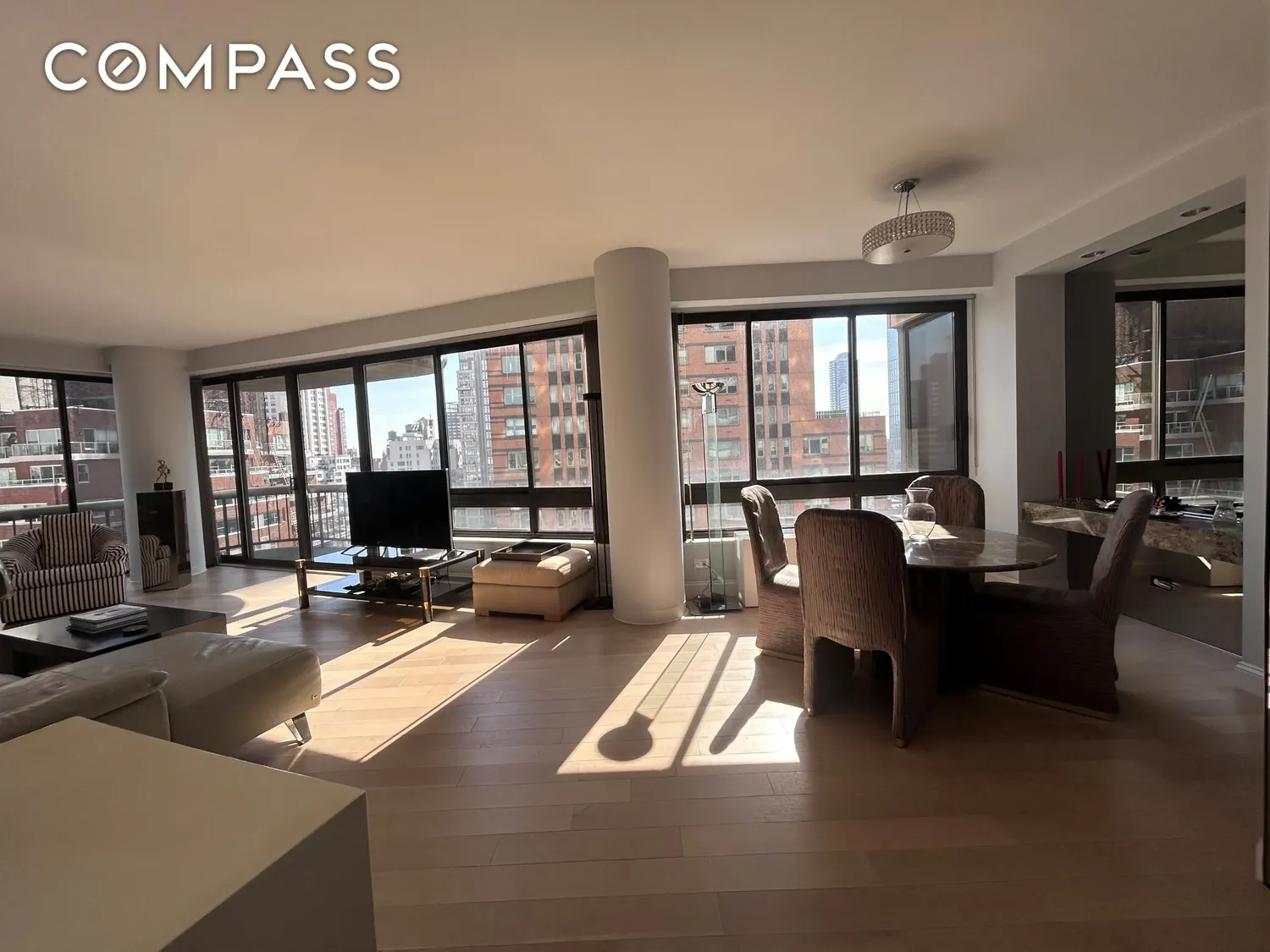 Welcome to 167 Ε 61st St, a stunning oversized 2-bedroom, 2.5-bathroom co‐op residence in a luxurious Manhattan highrise. This meticulously designed home boasts a thoughtful layout, offering 5 spacious rooms that combine functionality and elegance. The two bedrooms one facing east and one facing north offer private wing rooms each with its own setting. Second bedroom has a walk in closet and a large deep black lacquer wall unit with TV that can remain. Primary Bedroom has 5 closets and an en-suite marble bathroom and faces open and beautiful north. With mainly eastern and northern exposures, this apartment is bathed in natural light throughout the day receiving some west/south based on expansive windows and terrace with its 9' ceiling height. This home is beautifully accentuated by floor-to-ceiling and oversized soundproof windows adorned with custom shades and several walls of smoky mirrored walls, recessed lighting and marble ledge in the dining area.