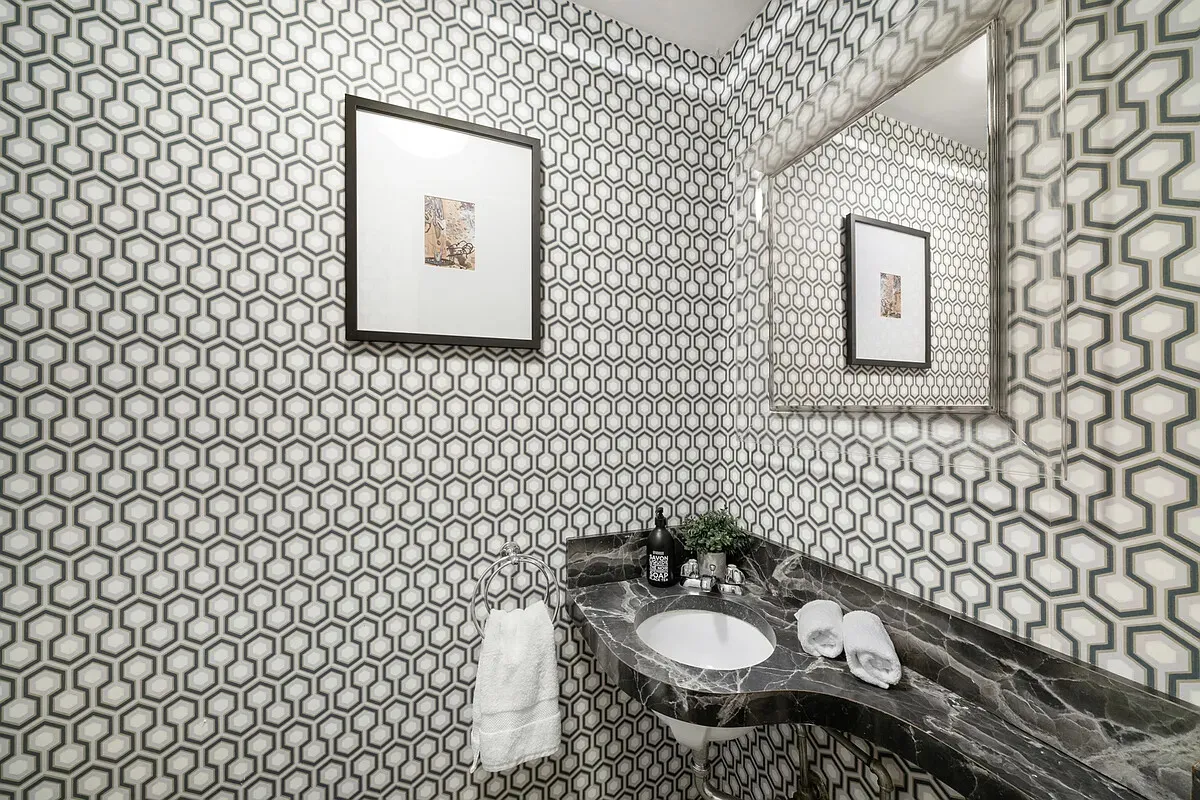 Inside, the house unfolds with a sense of grandeur and architectural theatre. A dramatic entry hall with triple arches and custom wallpaper designed by artist Peter Halley leads to a warm and inviting den with fireplace overlooking the spectacular double-height living room-an unforgettable first impression that is truly a "wow moment".