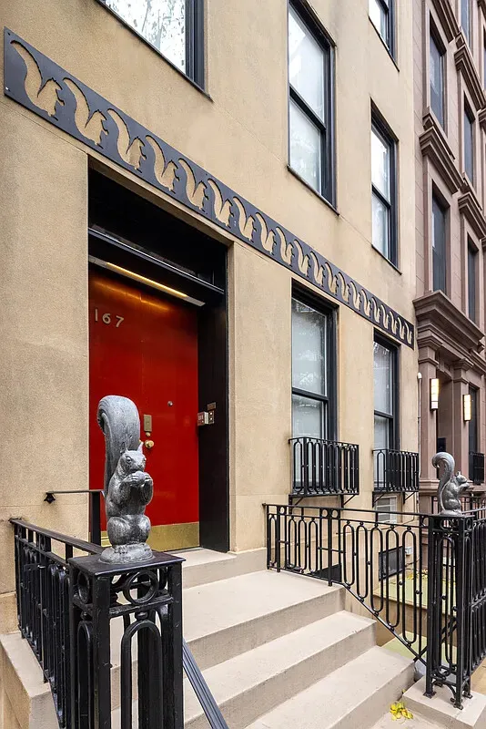 On East 74th Street, the home is immediately recognizable by its distinctive red lacquer doors and the beloved bronze squirrel sculptures created by sculptor Jane Canfield-a charming detail that has long earned the property the neighborhood nickname "The Squirrel House." Installed during the ownership of underwater explorer and department-store heir Peter Gimbel, the whimsical figures quickly captured the imagination of generations of neighborhood children.