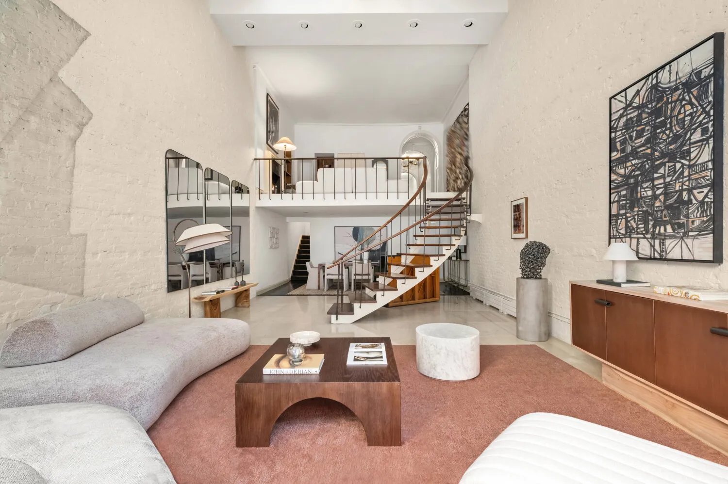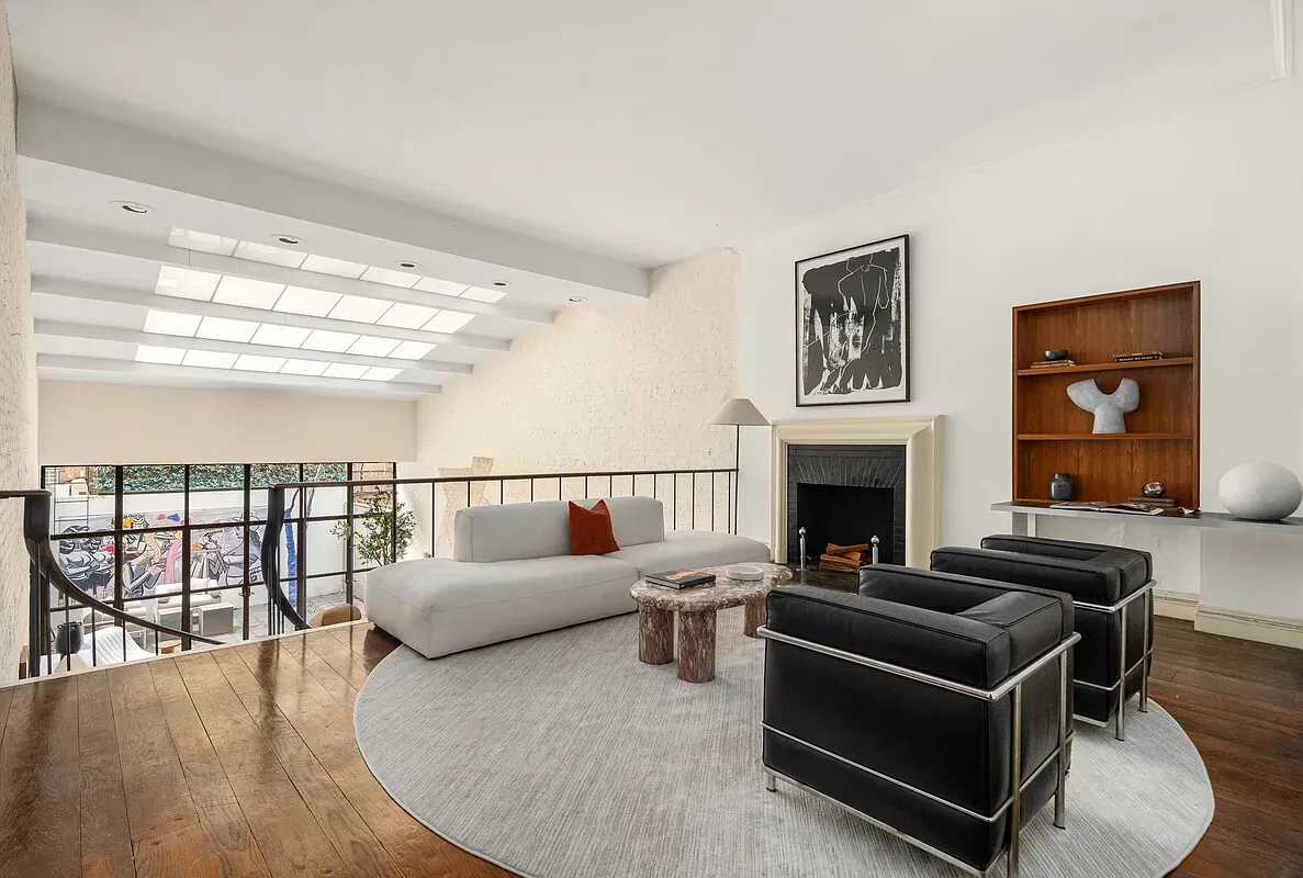 With ceilings rising approximately 19 feet, the living room reveals an extraordinary architectural volume rarely encountered in private homes. Bathed in natural light from a skylight above and framed by soaring brick walls, the room possesses the scale and presence of a private gallery. Floor-to-ceiling windows overlook the tranquil 350-square-foot garden, creating a striking visual connection between the dramatic interior and outdoor spaces.