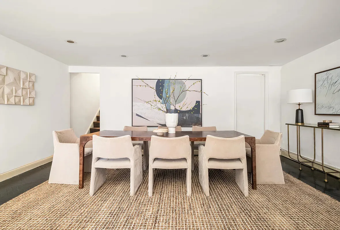 The room is an art collector's dream and an exceptional setting for entertaining. Guests arrive in unforgettable fashion, descending the graceful curved staircase that sweeps elegantly into the living room, creating a theatrical and memorable entrance. The space effortlessly accommodates large-scale works of art while remaining warm and inviting for gatherings both intimate and grand. Off the living room is a large dining area which leads to the kitchen.