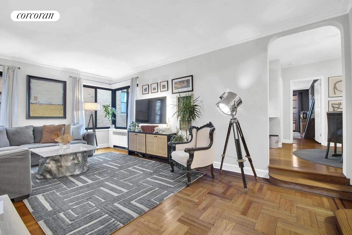 The grand foyer leads down to an expansive living room highlighted by south- and east-facing corner windows and ample space for a piano. Additional features include parquet and hardwood floors throughout, arched doorways, picture molding, and six generous closets. The updated bathroom offers an original cast-iron tub, classic 12x12 white tile, a modern vanity, and an illuminated medicine-cabinet mirror.
