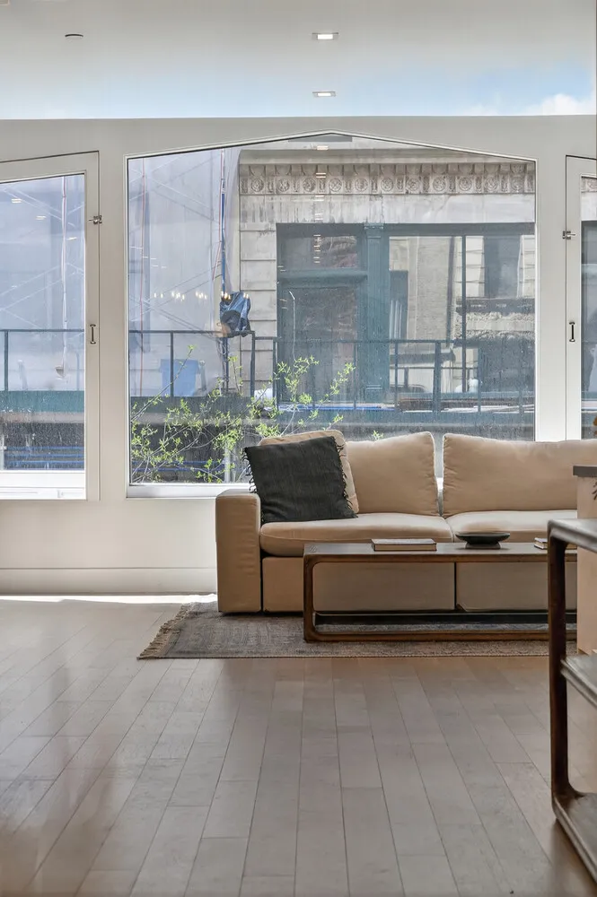 The elevator opens directly into a sun-filled great room with architecturally significant vaulted display window spanning the full width of the building, where oversized south-facing windows, high ceilings, exposed brick, and wide-plank white oak floors create a classic downtown loft atmosphere. The open kitchen is centered around a large island and outfitted with stone countertops, custom cabinetry, and premium appliances, seamlessly connecting the kitchen, dining, and living areas into a space designed for both entertaining and everyday living.