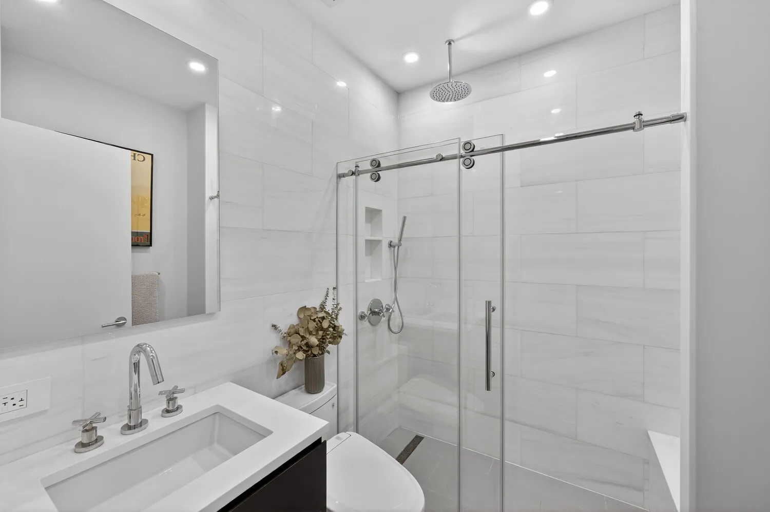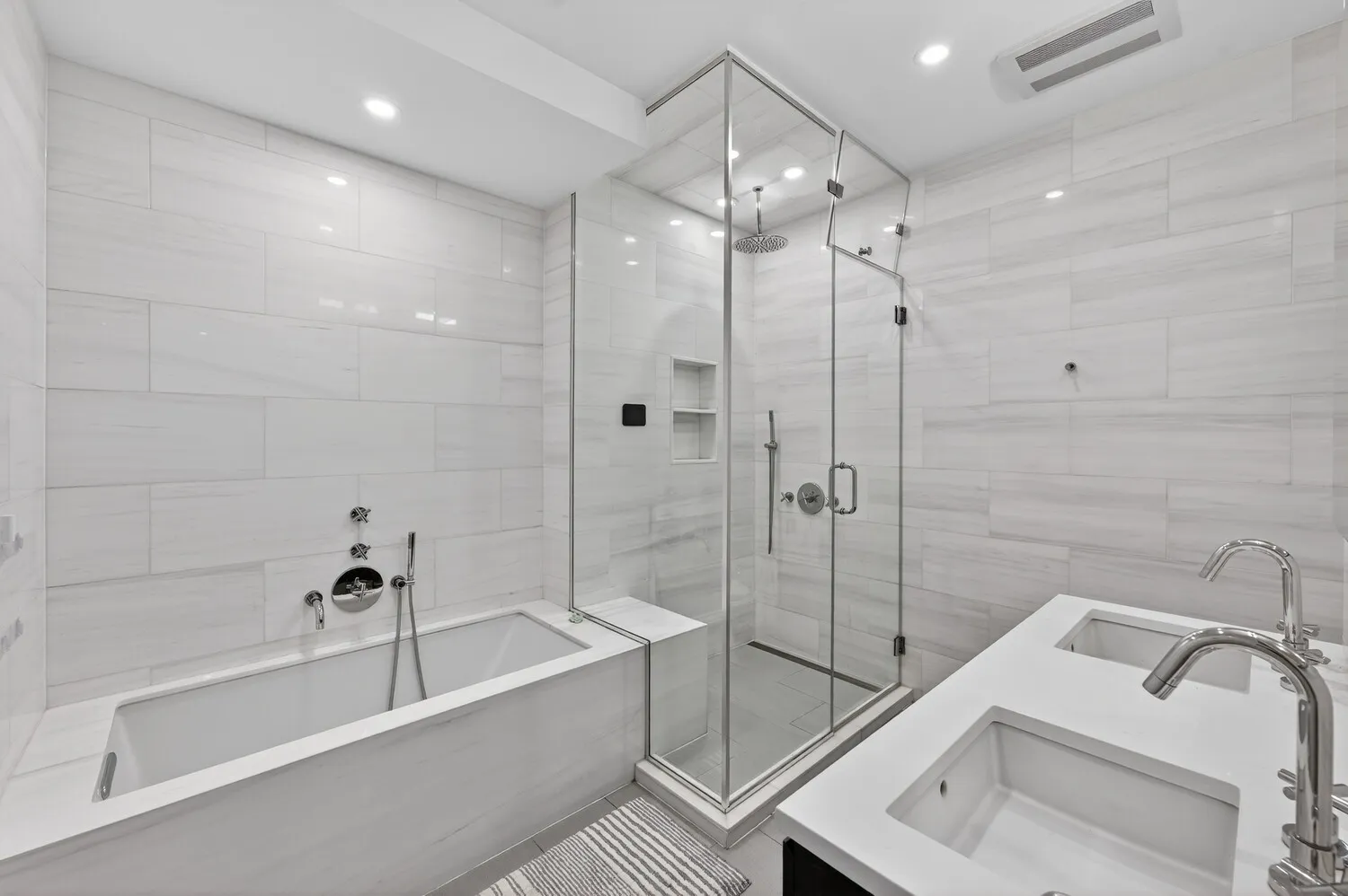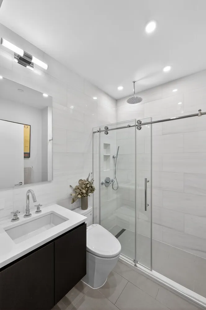 Both bedrooms are positioned at the quiet rear of the home with northern exposures. The primary suite features generous closet space and a spa-like en-suite bathroom with a double vanity, soaking tub, and separate shower. The second bedroom is well-proportioned and located near the second full bathroom, making it ideal for guests, a home office, or nursery. Additional features include central air conditioning, an in-unit washer/dryer, recessed lighting, and thoughtful built-ins throughout.