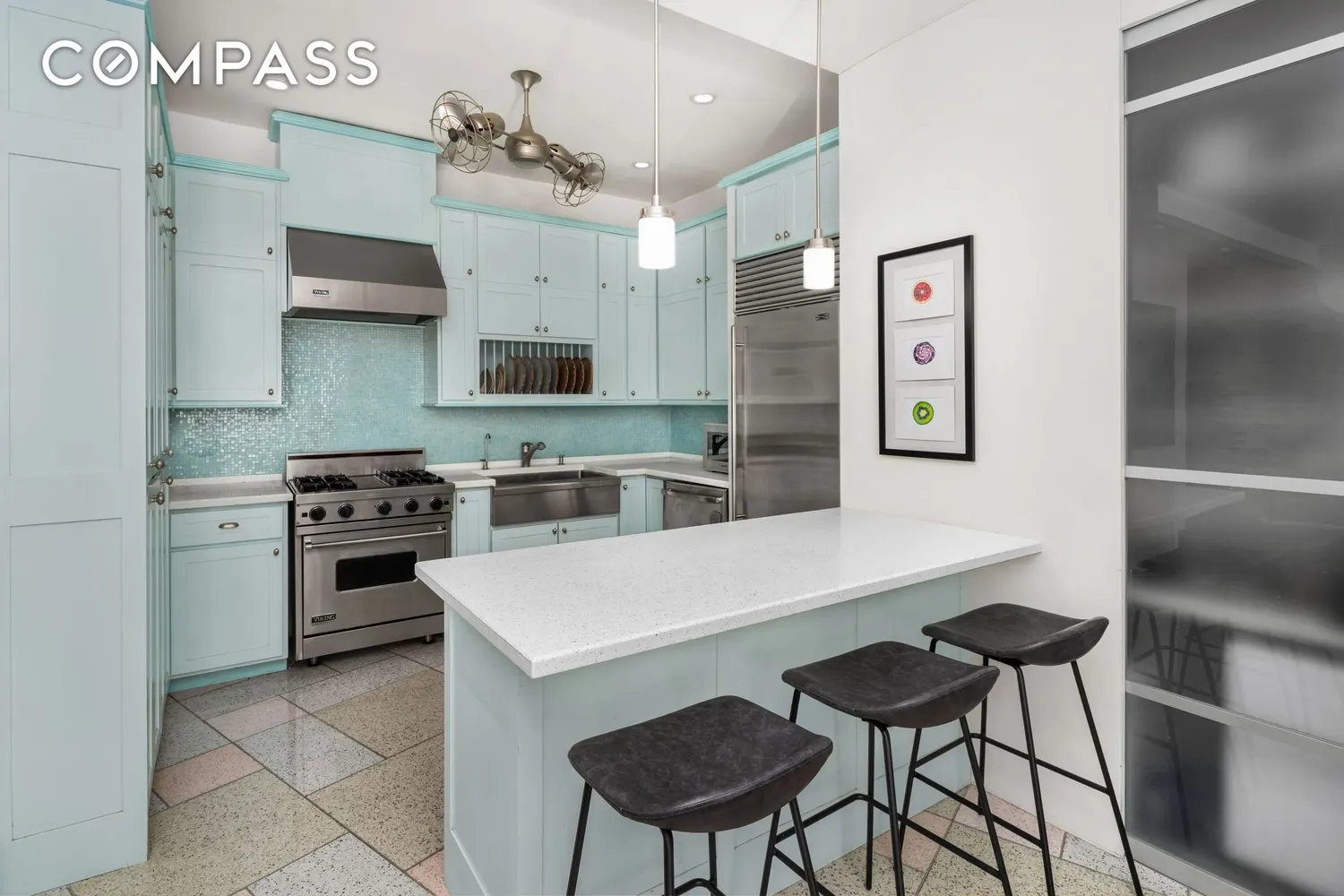 The open kitchen is outfitted with top-tier appliances, including a Sub-Zero refrigerator and Viking range, a vented exhaust system, complemented by custom cabinetry and a built-in breakfast bar. Adjacent to the kitchen, a versatile space behind frosted glass doors functions beautifully as a pantry, bar, or home office.