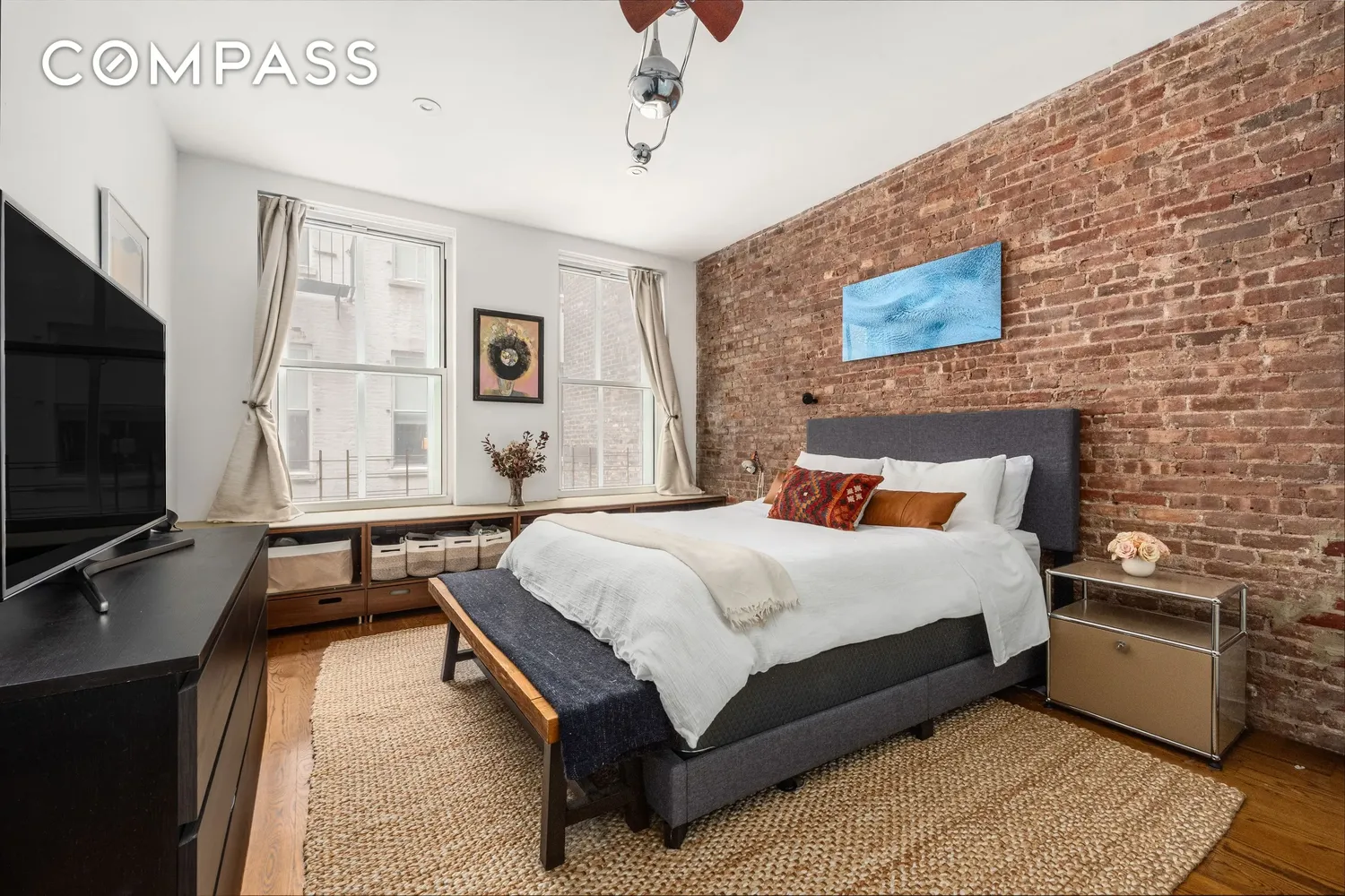 A hallway leads to a large laundry room featuring a full-size washer and dryer, followed by a thoughtfully designed full bathroom. The secondary bedroom features exposed brick and two north-facing windows with functional built-ins below, adding character and charm.