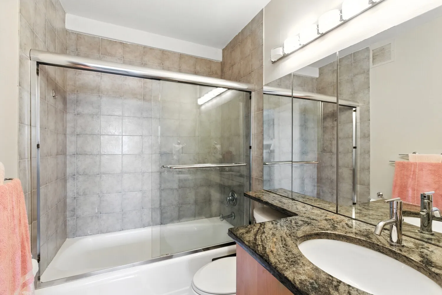The oversized primary suite offers abundant storage and a private desk area, while both bathrooms have been tastefully redone. Additional conveniences include an in-unit washer/dryer and custom storage throughout.