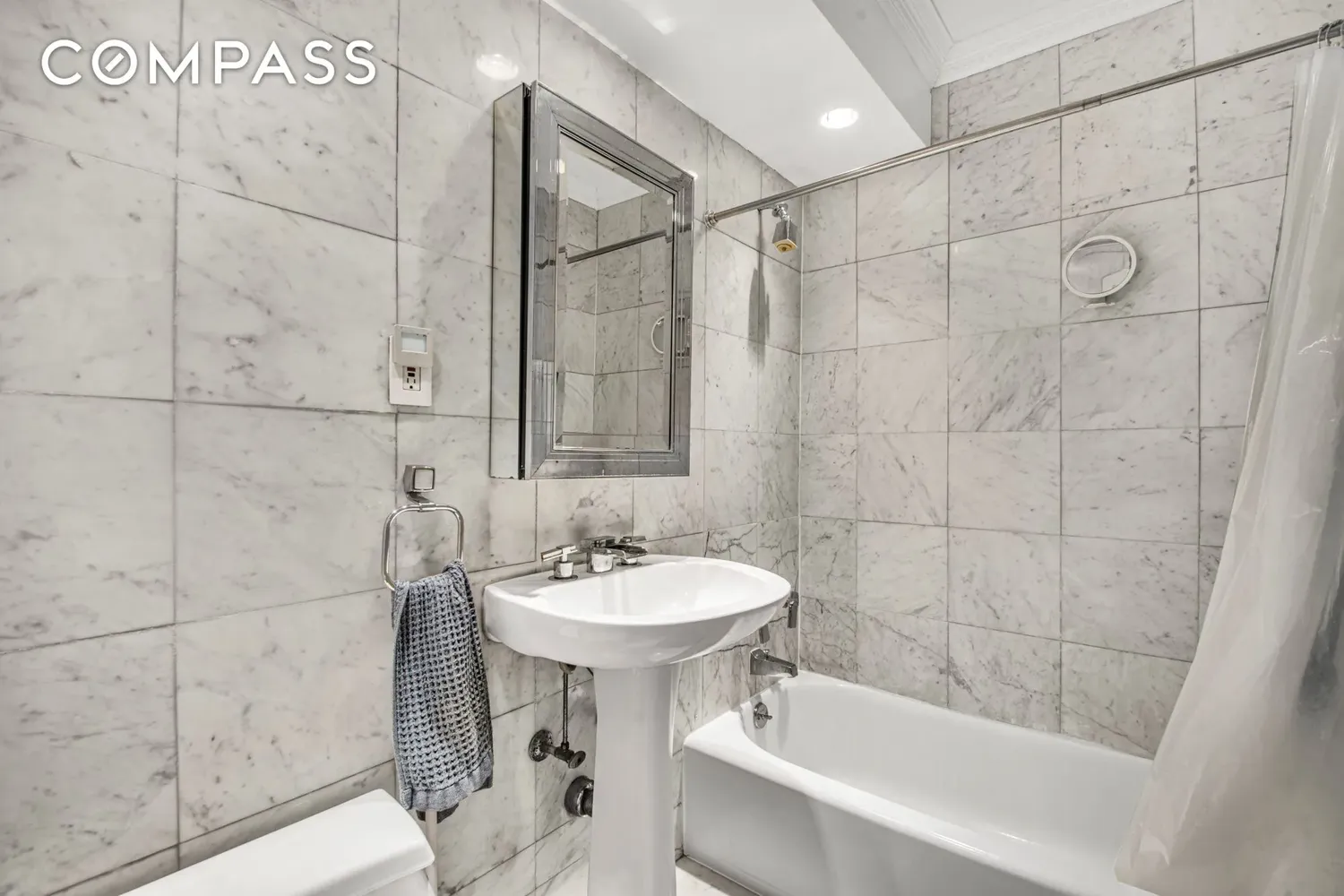 The well-appointed pass-through kitchen, where wood cabinetry, granite countertops and tile backsplashes surround upscale stainless steel appliances, including a gas range, French door refrigerator and dishwasher drawers. Sleep soundly in the king-size bedroom featuring a roomy closet and plenty of space for a desk and additional furnishings. A full bathroom with a large tub/shower, pedestal sink, and floor-to-ceiling marble tile completes this move-in ready Brooklyn beauty.